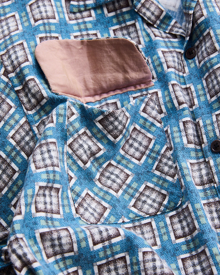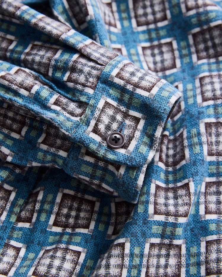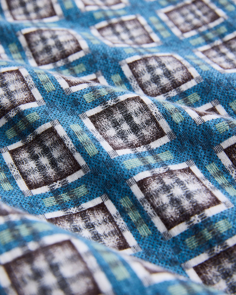 1940〜50年代のプリントネル素材をリファレンスとしたビスポーク生地を使用したネルシャツ。型は着用しやすく緩めのシルエット。当時のプリントは主に手作業によって施されており、生地表面を抜けて裏面にまでインクが付着する「裏抜け」が特徴。繊細なチェック柄も崩れないように5版のハンドスクリーンプリントで丁寧に表現し、後起毛加工により柄の深みと独特の風合いを引き出しています。ヴィンテージの風合いを保ちつつ、現代における快適さを兼ね備えた一着に仕上がりました。