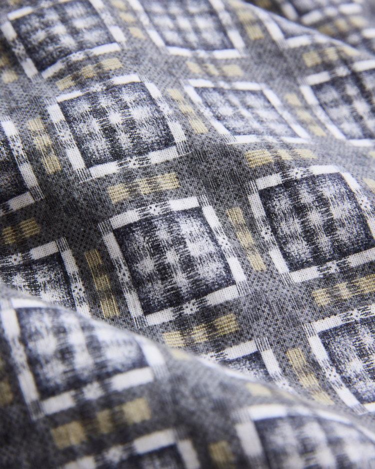 1940〜50年代のプリントネル素材をリファレンスとしたビスポーク生地を使用したネルシャツ。型は着用しやすく緩めのシルエット。当時のプリントは主に手作業によって施されており、生地表面を抜けて裏面にまでインクが付着する「裏抜け」が特徴。繊細なチェック柄も崩れないように5版のハンドスクリーンプリントで丁寧に表現し、後起毛加工により柄の深みと独特の風合いを引き出しています。ヴィンテージの風合いを保ちつつ、現代における快適さを兼ね備えた一着に仕上がりました。