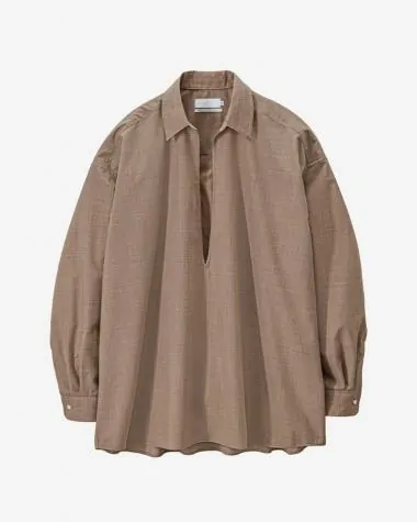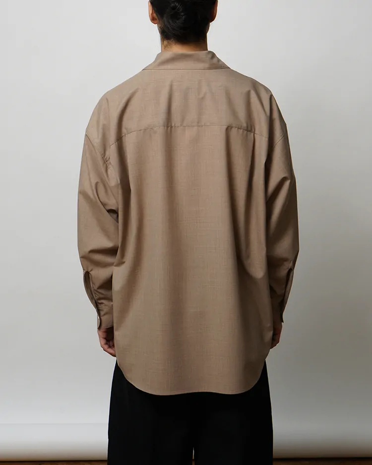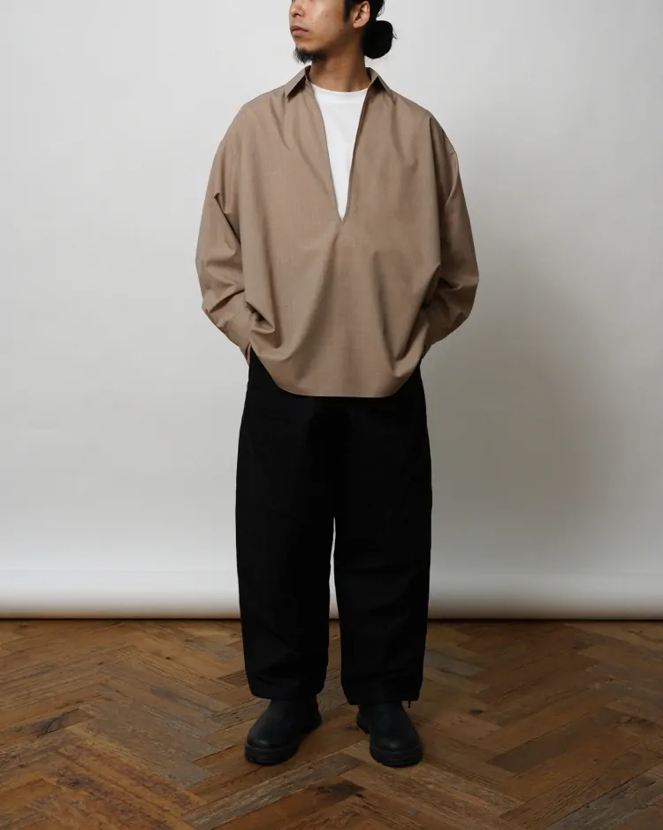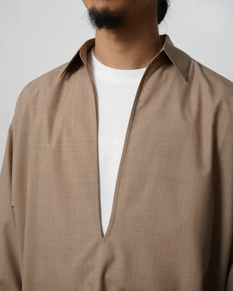 深めのVネックが品の良い印象を与えるスキッパーシャツ。素材には、吟味されたSUPER160'sの上質な原料を用いたオリジナルのウールトロピカルを採用。わたの段階で染色するトップ染めにより奥行きのある色合いと毛羽立ちを抑えた滑らかなタッチが魅力です。さらに表面には撥水加工を施し、雨を弾きつつ防汚効果も兼ね備えています。