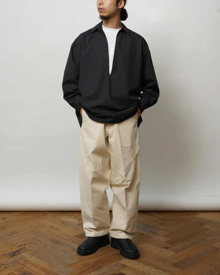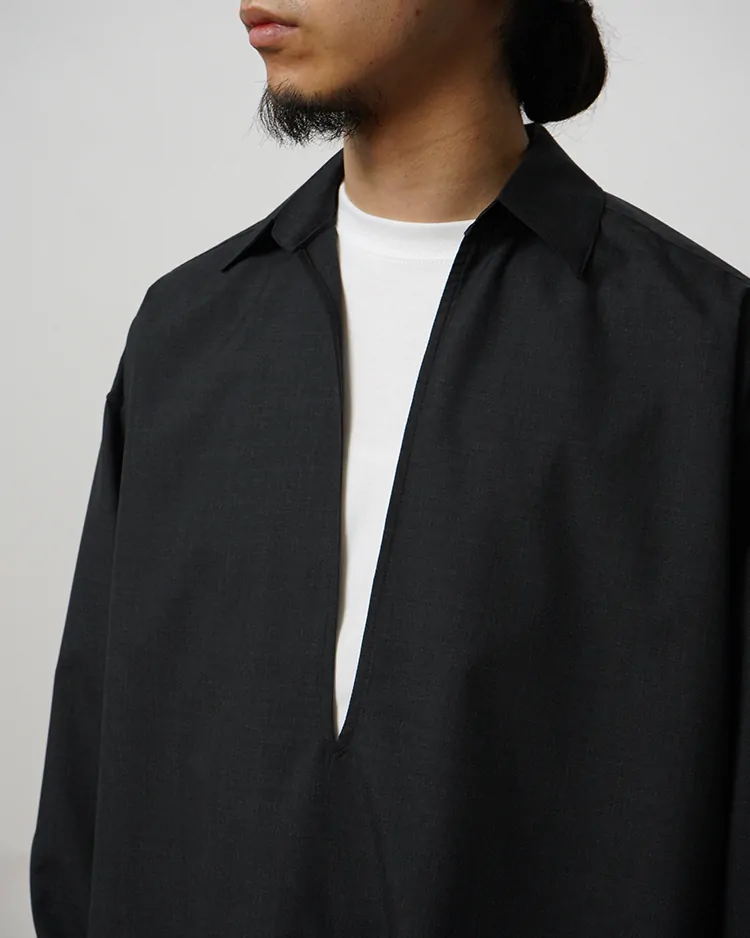 深めのVネックが品の良い印象を与えるスキッパーシャツ。素材には、吟味されたSUPER160'sの上質な原料を用いたオリジナルのウールトロピカルを採用。わたの段階で染色するトップ染めにより奥行きのある色合いと毛羽立ちを抑えた滑らかなタッチが魅力です。さらに表面には撥水加工を施し、雨を弾きつつ防汚効果も兼ね備えています。