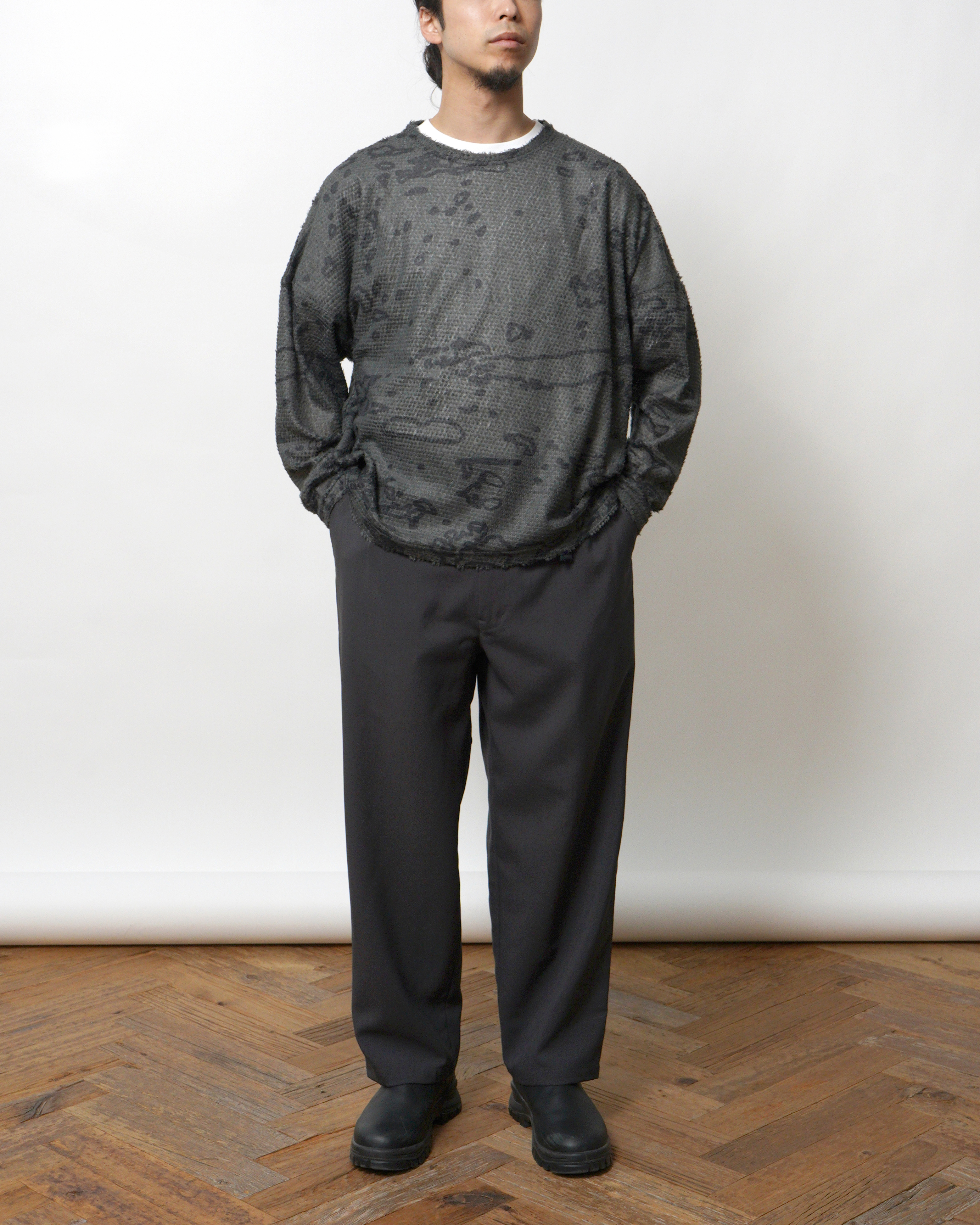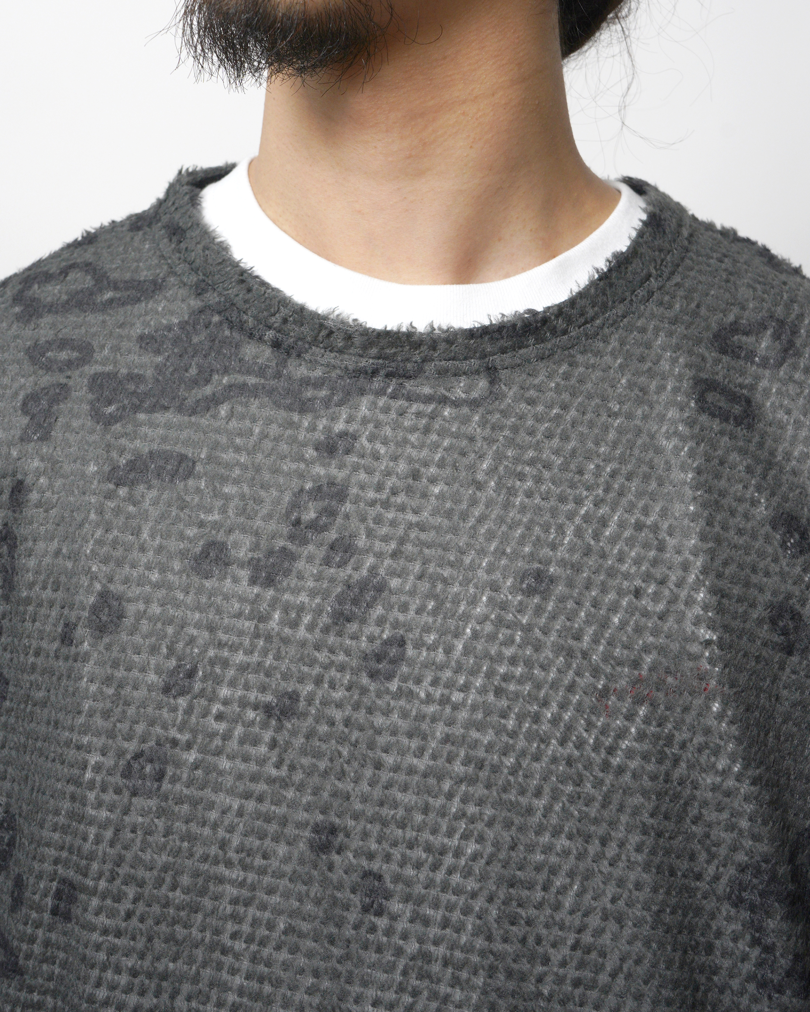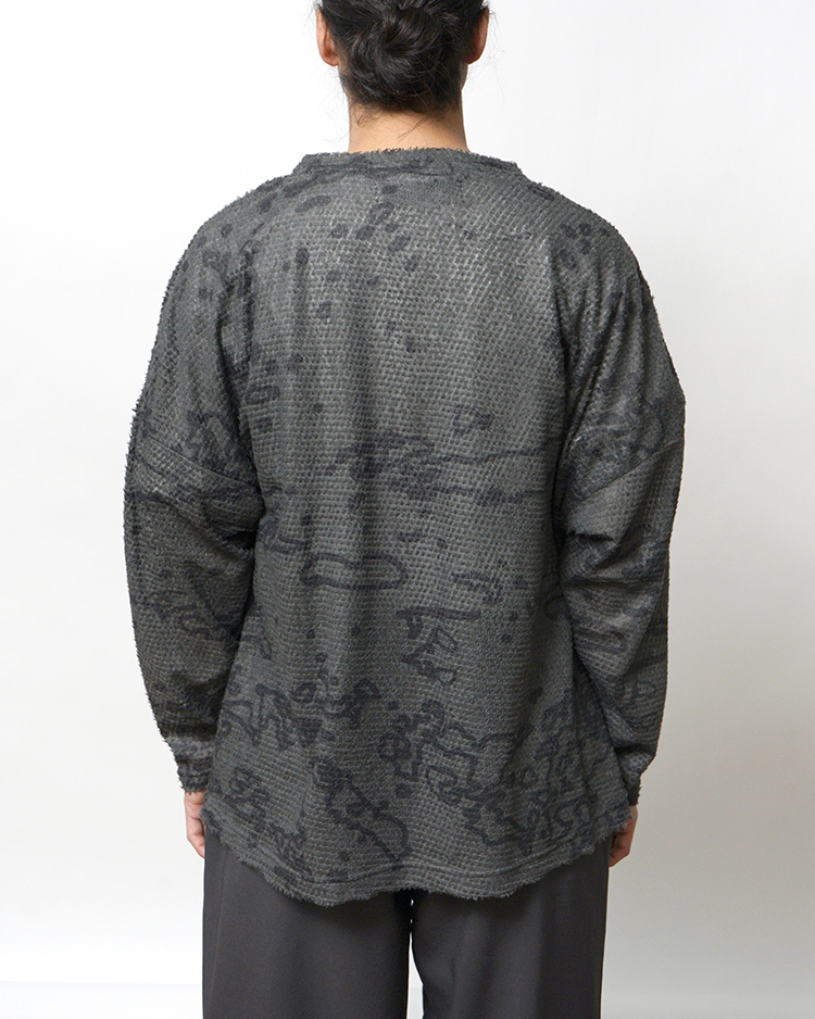 超軽量、保温、高い通気性、速乾機能素材POLARTEC®︎のALPHA DIRECTに全面にグラフィックパターンを落とし込んだセーター。クルーネック。ボクシーフィット。