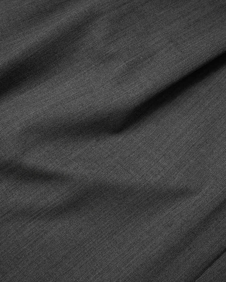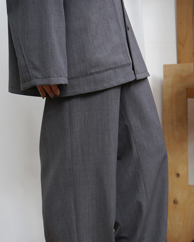 毛織物の産地である尾州で織り上げた、72番双糸のギャバジン素材を使用しています。高密度に織ることで、ハリとコシを備えながらも、しなやかで上品な風合いに仕上げました。シワになりにくく、立体的なシルエットを美しく保つ素材です。ワンタック仕様で腰回りに適度なゆとりがあるストレートシルエットのスラックスです。