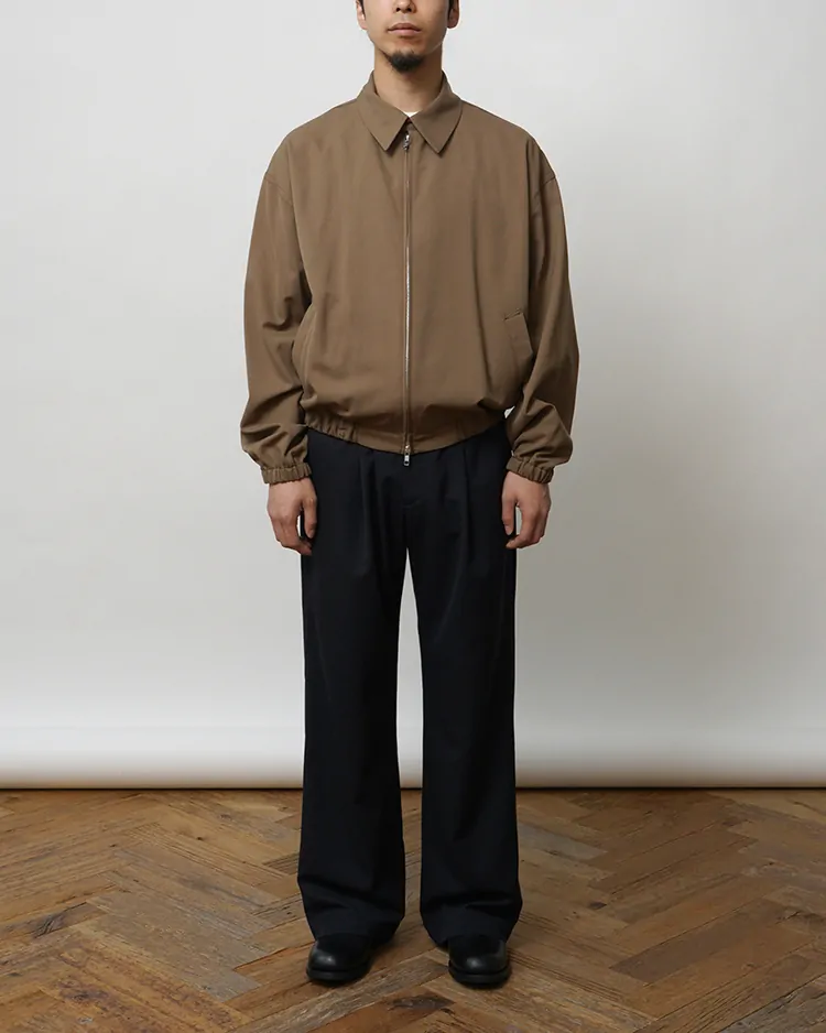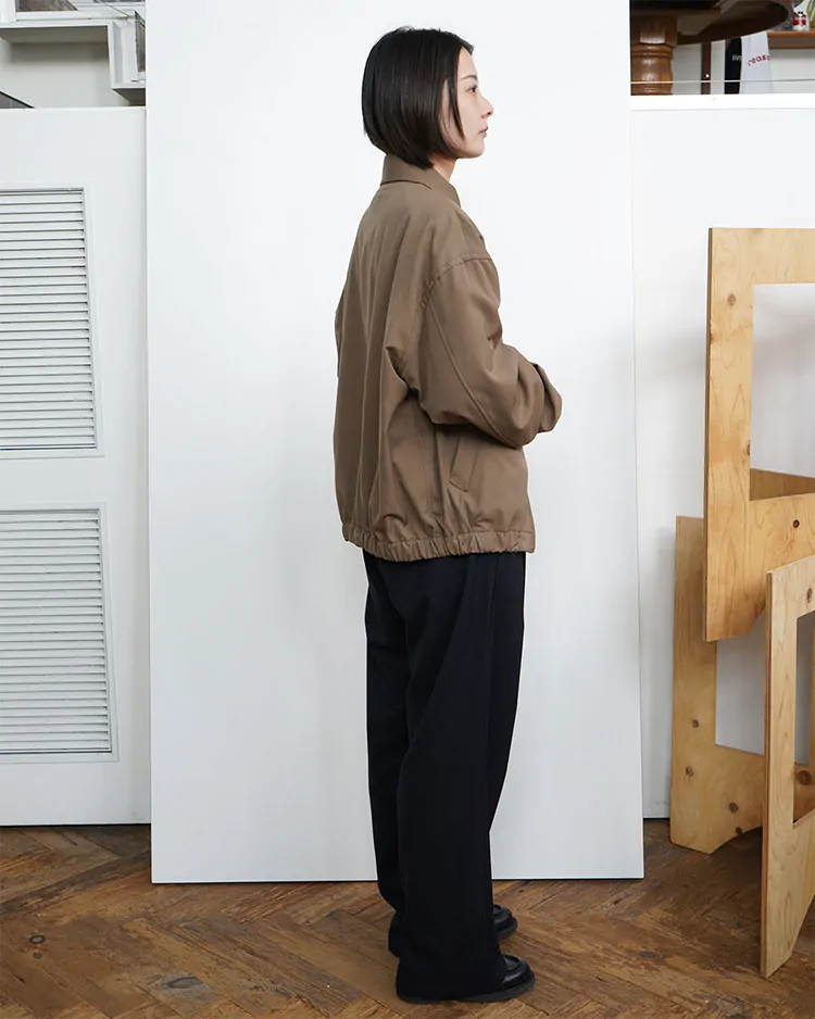 毛織物の産地である尾州で織り上げた、72番双糸のギャバジン素材を使用しています。高密度に織ることで、ハリとコシを備えながらも、しなやかで上品な風合いに仕上げました。シワになりにくく、立体的なシルエットを美しく保つ素材です。ワンタック仕様で腰回りに適度なゆとりがあるストレートシルエットのスラックスです。