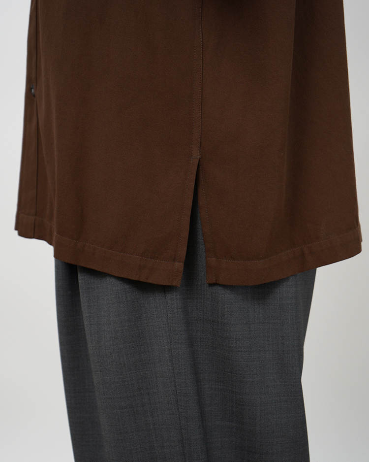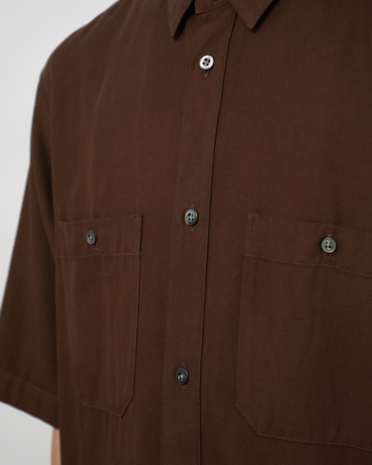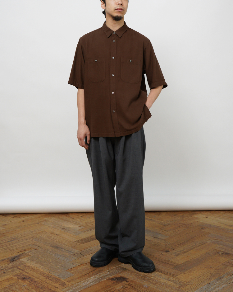 ややオーバーサイズな、リラックスしたシルエットが特徴の半袖シャツ。インナーとしても1枚でも着用しやすいサイズ感です。背中心はヨーク切り替えを採用し、スッキリとしたアームホール周りに仕上げています。フロントポケットは、ワークシャツのディテールを踏襲しています。製品染を施しているので、洗濯で縮みが起きず、取り扱いも楽です。
