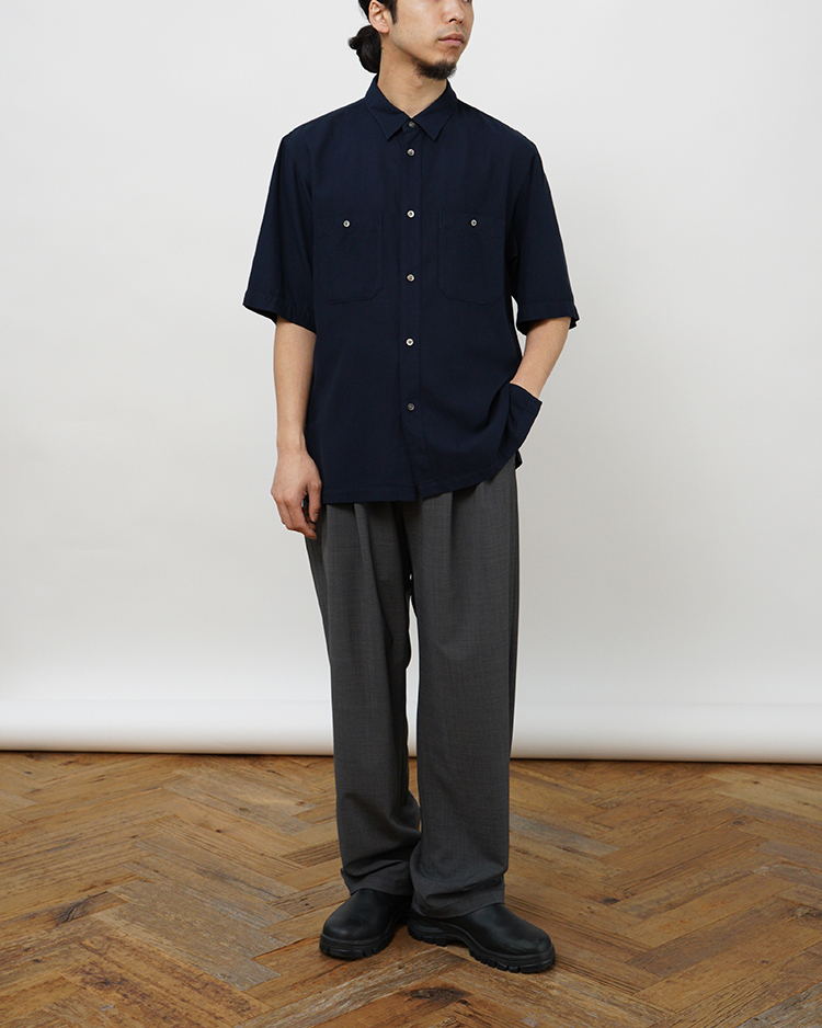 ややオーバーサイズな、リラックスしたシルエットが特徴の半袖シャツ。インナーとしても1枚でも着用しやすいサイズ感です。背中心はヨーク切り替えを採用し、スッキリとしたアームホール周りに仕上げています。フロントポケットは、ワークシャツのディテールを踏襲しています。製品染を施しているので、洗濯で縮みが起きず、取り扱いも楽です。