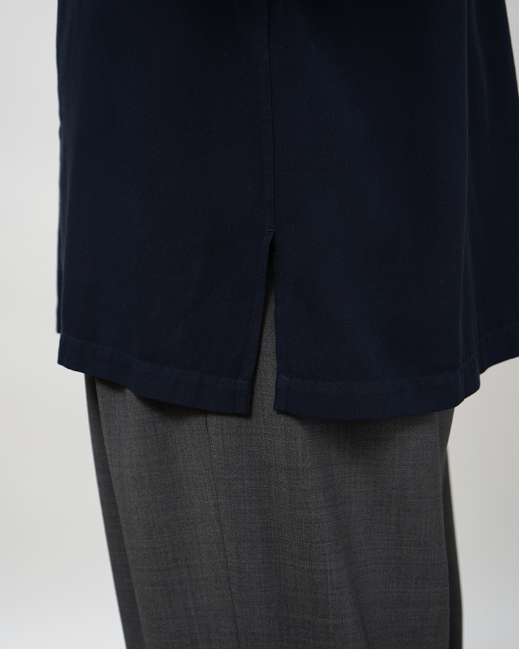 静岡県にて、やや甘めに織り上げた強撚のビエラ素材です。通常のブロードには無い、ビエラ素材独特の綾目が立つ表情と膨らみ、落ち感が特徴です。シルクの程よい光沢と、綿の強撚糸のさらっとしたタッチと落ち感を併せ持ったオリジナル素材です。