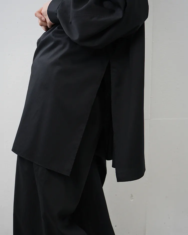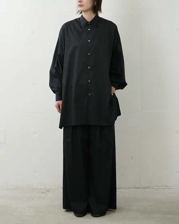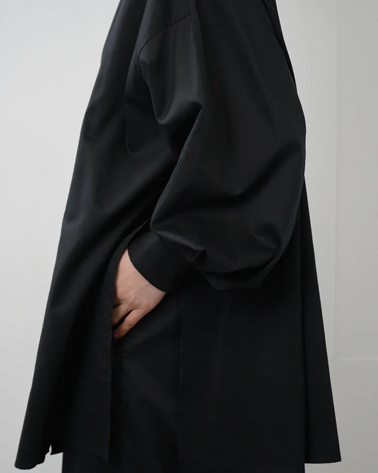 背中から一続きのヨークスリーブとボリュームのある袖がポイントのレギュラーカラーシャツ。深いサイドスリットが動くたびに揺れ、ドレープ感が美しい一枚。シリコンを原料にした特殊樹脂を含浸させた超長綿の平織り素材は、シルクのような滑らかな質感で着心地も抜群です。同素材のパンツと合わせてセットアップのスタイリングも楽しめます。