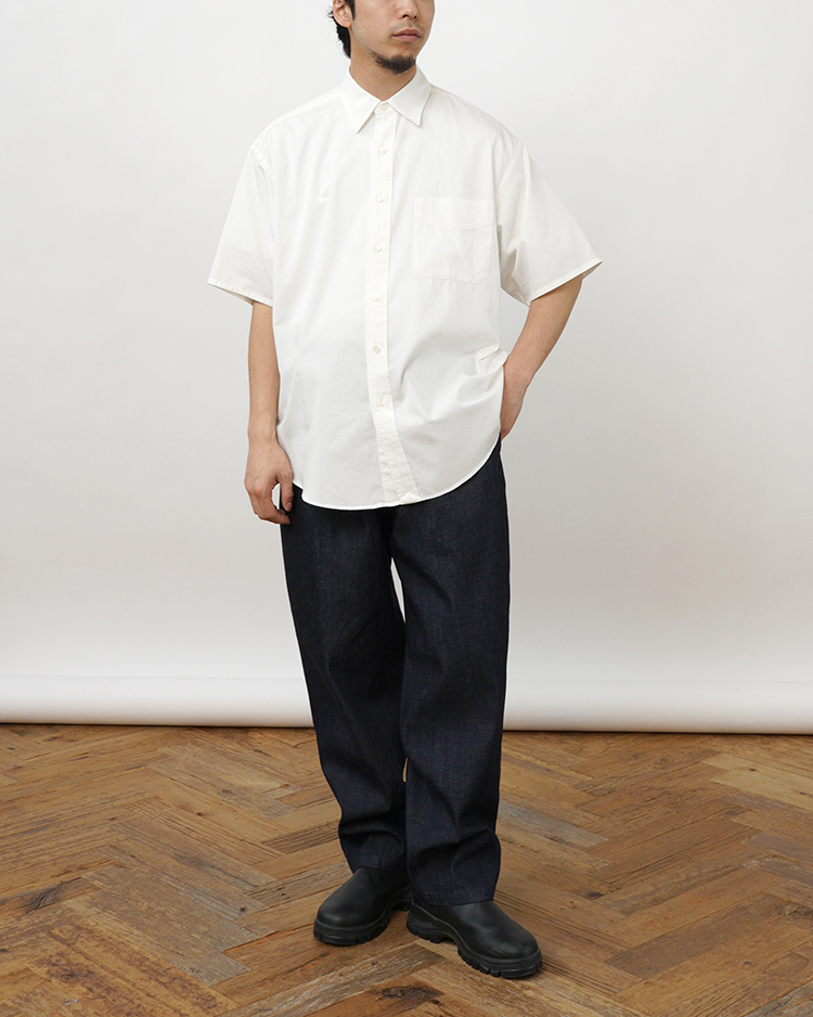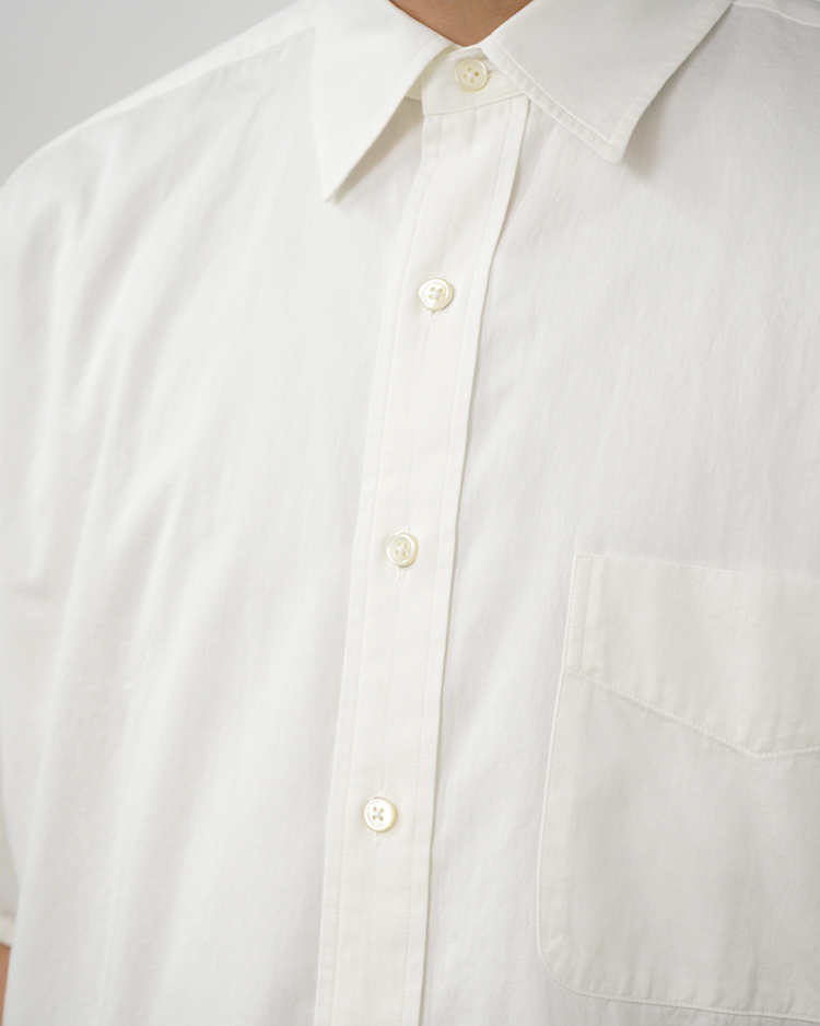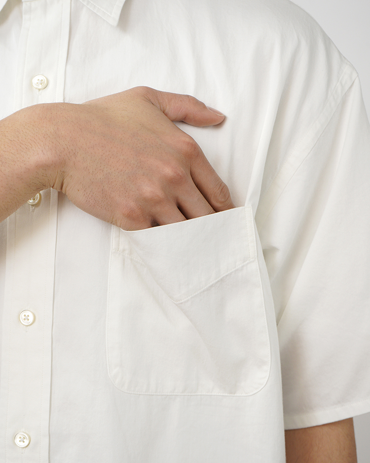 インド産のオーガニックコットンを使用した、サステナブルなツイル素材の半袖シャツです。古着をベースにウォッシュ加工を施し、自然な色落ちと柔らかな風合いを表現。カジュアルでリラックス感のある印象に仕上げています。