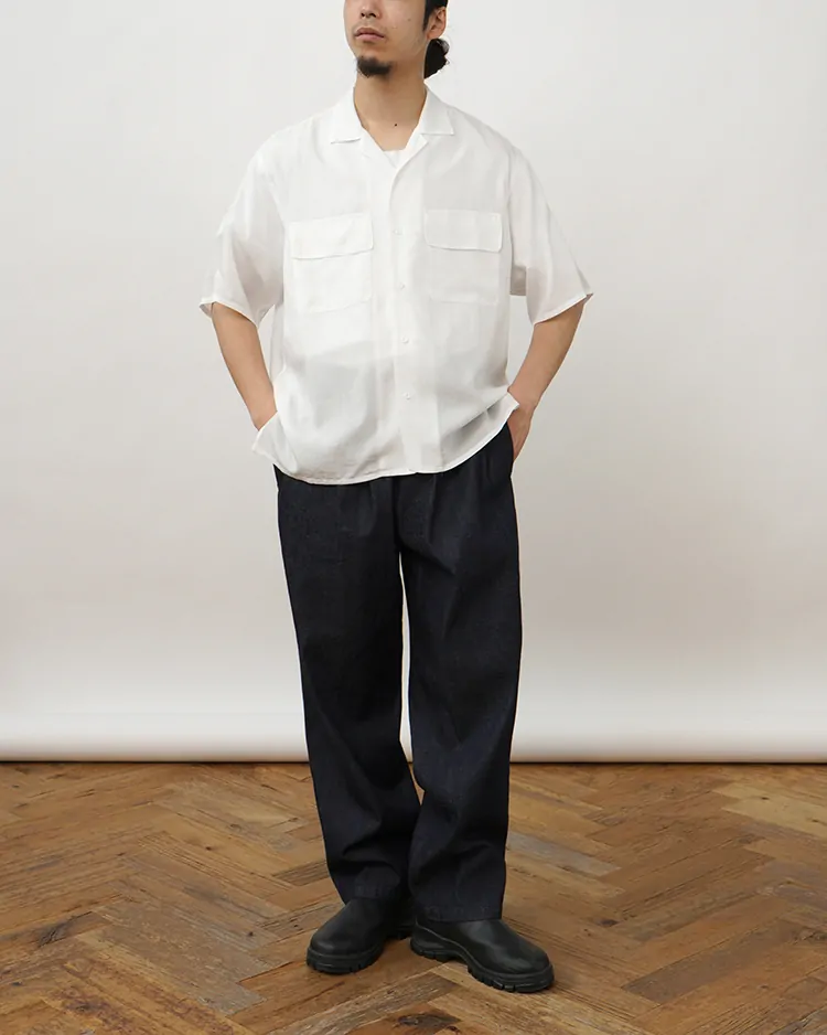 サステナブルな再生繊維であるテンセルを使用した、接触冷感性と自然なドレープ感が特徴のオープンカラーシャツです。ホワイトは洗い加工を施し、柔らかな風合いに。ネイビーは製品染めにより、ヴィンテージライクな色合いに仕上げています。