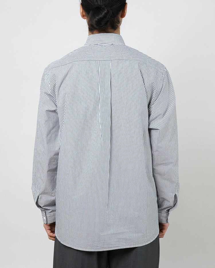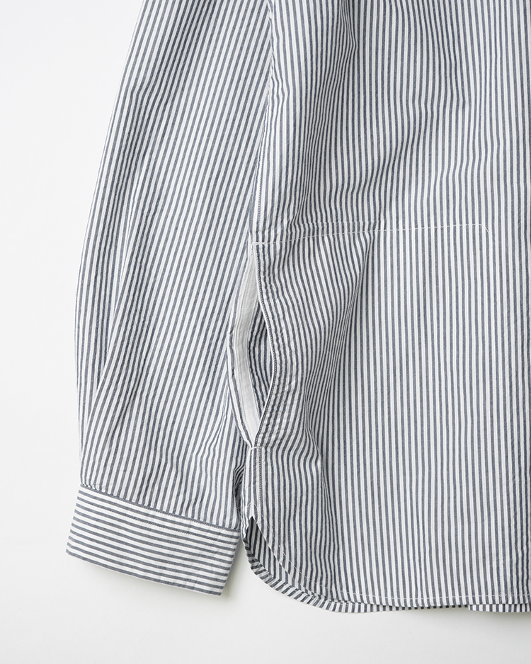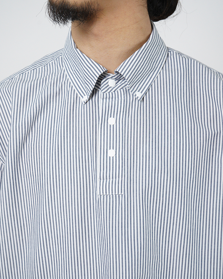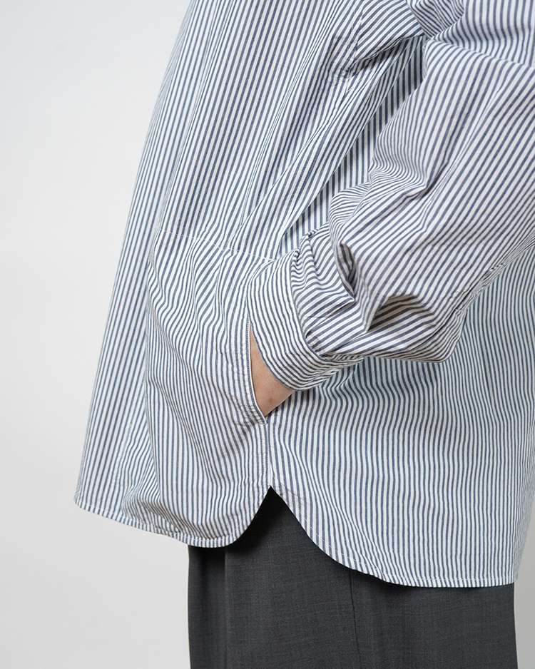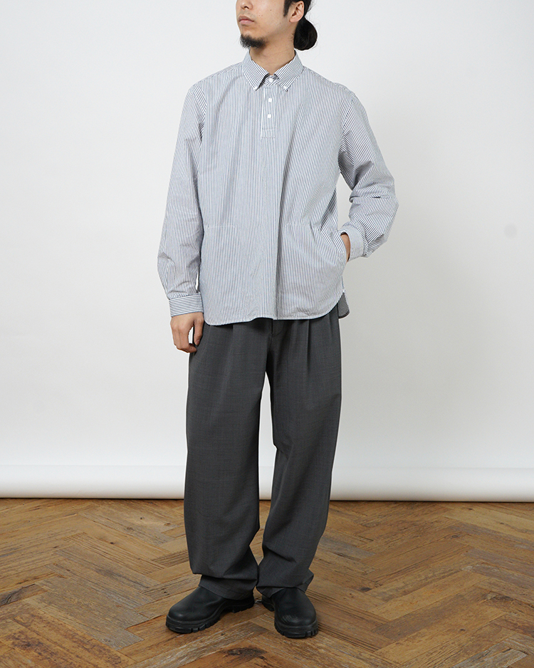 ヤエカのシグネイチャー。スラッシュポケットとスナップボタンが特徴のシャツ。 身幅にゆとりを持たせたP/Oタイプ。 生地は高密度の平織り。