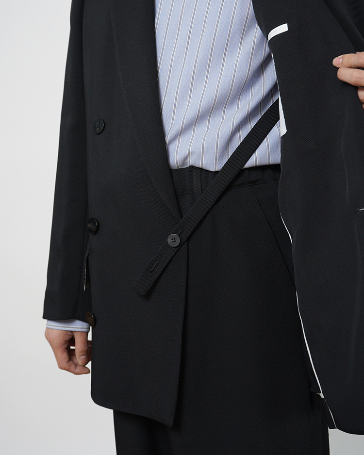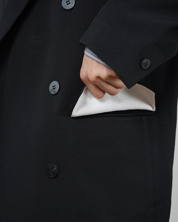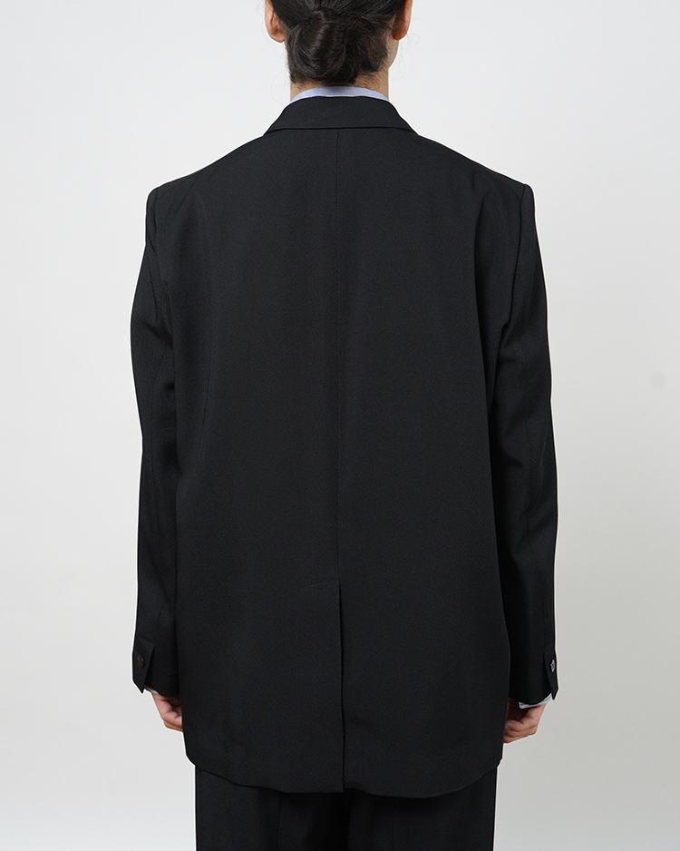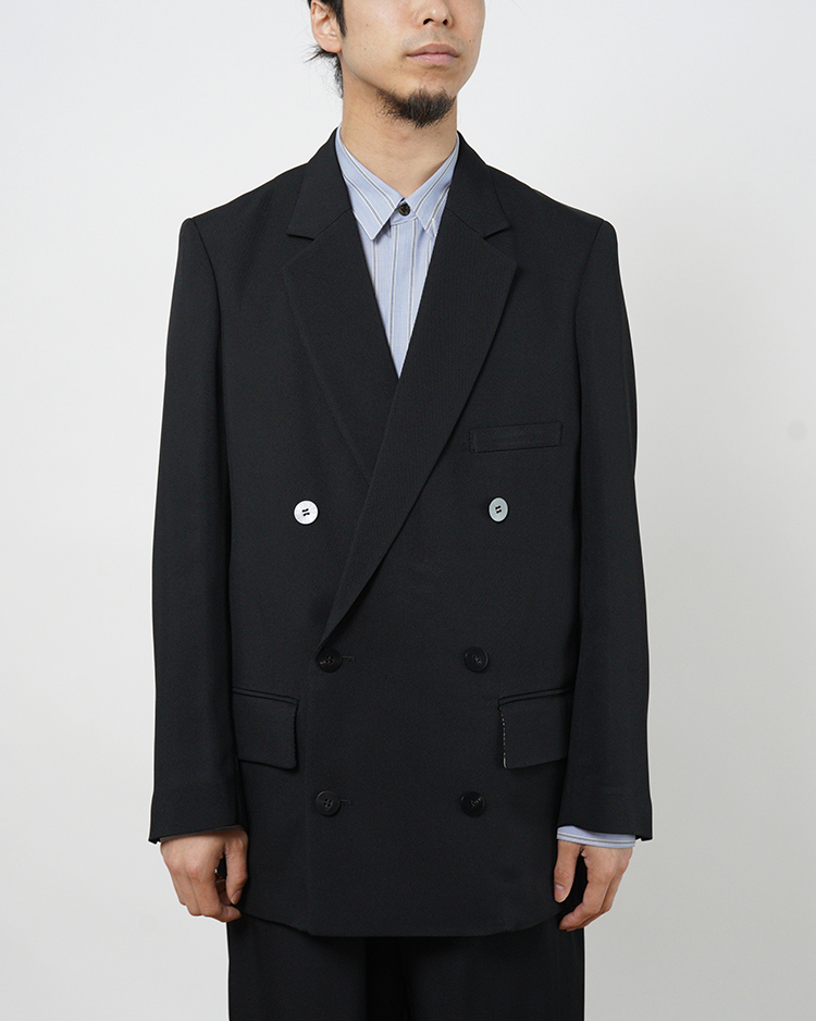 定番のダブルのテーラードジャケット。肩回りの着心地を追求した独自のアームホールの形状と後のドレープ感が特徴。内掛けのタブ付き。一重仕立て。