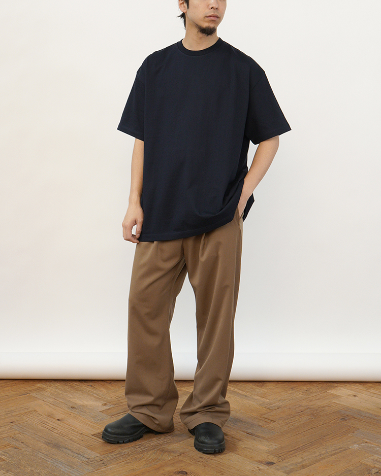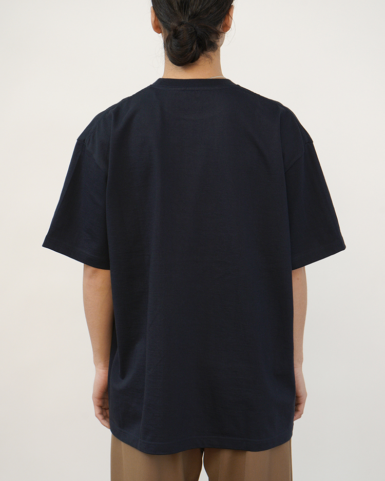 日本に数台しか稼働していない貴重な吊り編み機で作成した、しっかりした厚みとコシのある屈強な丸胴天竺を使用したオーバーサイズTシャツ。定番のパックTeeで使用している吊天竺は30番綿糸を2本で撚るところ、3本撚りにした糸に空気を含みながら時間をかけてゆっくりと編み上げた素材。洗濯後も伸びにくく、脇に縫い目も無いため肌に縫い代があたらず、着心地が良く透けないのが特徴。※サイズは 1 、2の展開。Size 1 = 通常のOversized Tee相当、Size 2 = さらにワンサイズ大きめの設計。