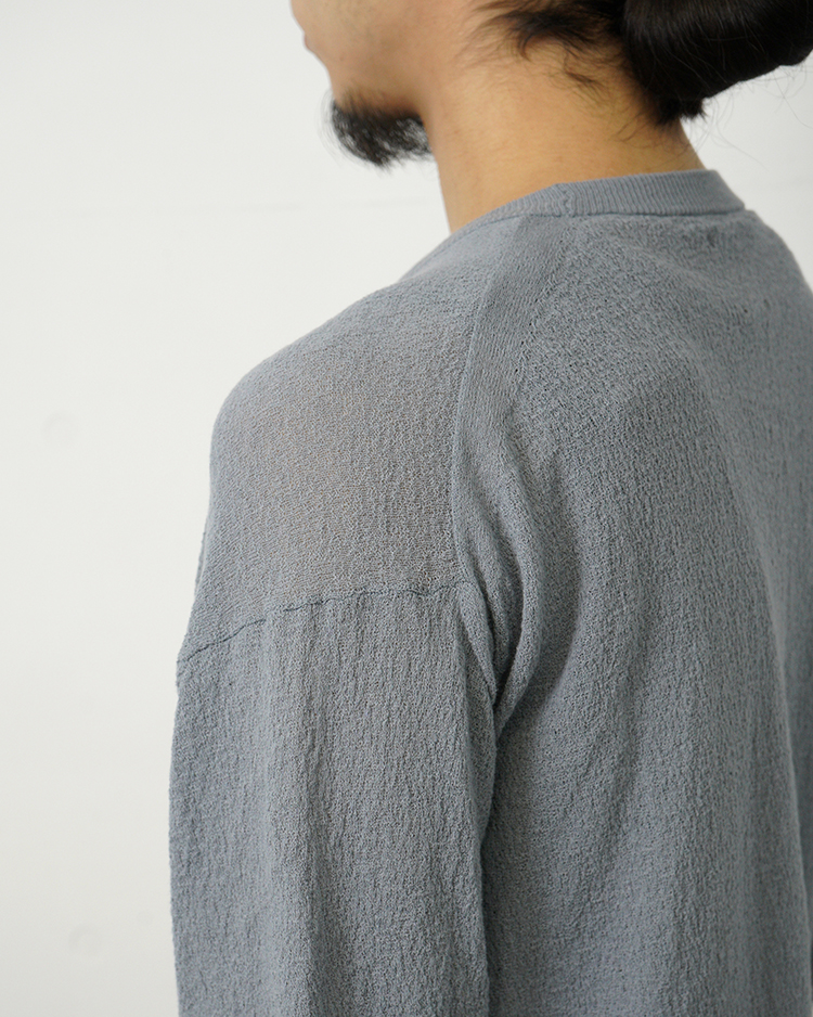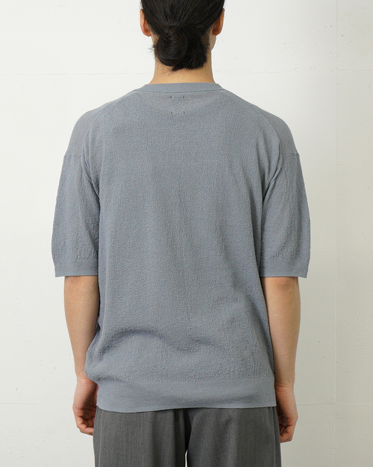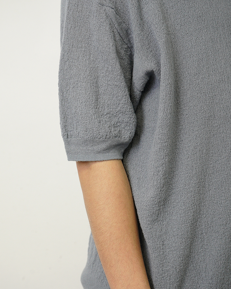 スヴィンコットンを特殊紡績で強撚に仕立て、さらに撚糸を加えることで、布帛の楊柳生地のような独特の表情を表現したシリーズ。ドライな風合いに加え、肌に触れる面積を抑える設計により、清涼感あふれる着心地を実現しています。