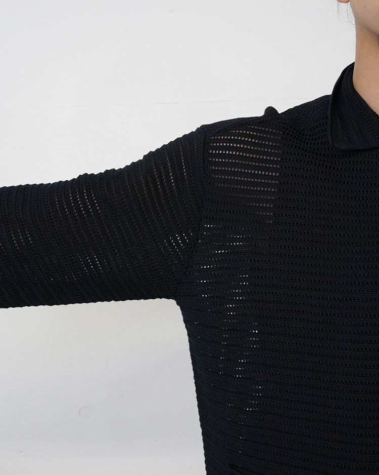 細番手のコットン糸に、天然由来の特殊樹脂をコーティングした糸を多本取りで透かし編みで編み立てたサマーニットシリーズ。肌が透けにくい編柄を採用しつつ、通気性に優れた涼やかな編地が特徴となっています。