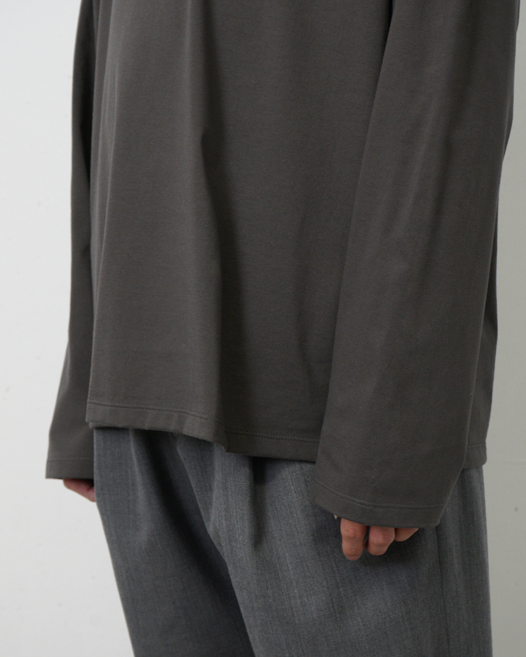 肌着やタオルにも使用される上質なインド産の超長綿。そのワタから、通常以上に丁寧に雑物を取り除き、毛羽立ちの少ない均一な太さに紡績した糸を使用。度目を詰めて編み上げた天竺生地は、ほどよい光沢感と滑らかで清涼感のある肌触りが特長です。シンプルな佇まいながらも、インナー・トップスとして幅広く活躍する汎用性の高いシリーズに仕上げました。