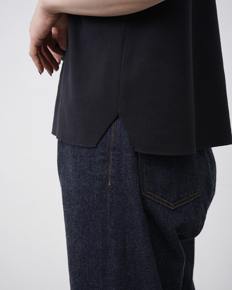 BATONER夏の定番として高い支持を集める、32ゲージスムースシリーズ。世界でも稀少な超ハイゲージの横編機を用い、超細番手のコットン強撚糸をスムース編みで丁寧に編み立てています。ニットならではのすっきりとした上品なディテールに加え、1枚で着用しても安心感のある適度な厚みが魅力。さらに、スムース編みによる優れたキックバック性で型崩れがしにくく、長く美しいシルエットを保ちます。
