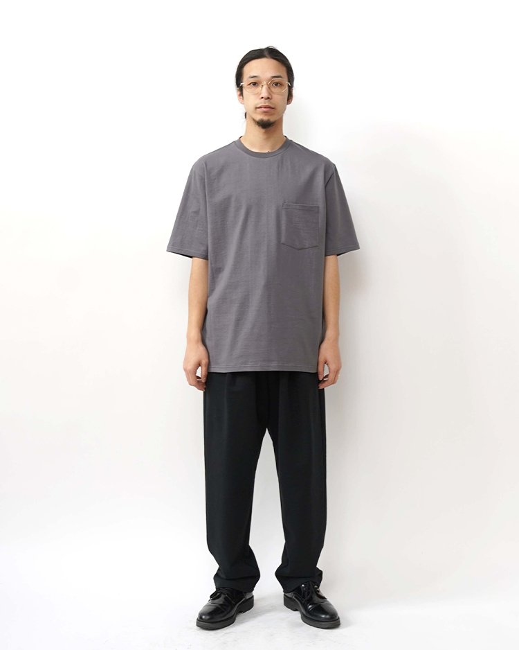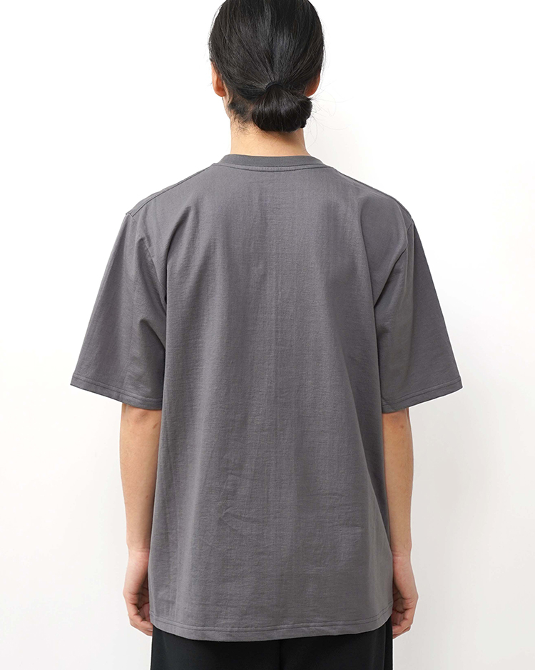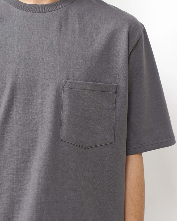 日本に数台しか稼働していない貴重な吊り編み機で作られた、適度にコシのある度詰め丸胴天竺を使用したショートスリーブのポケット付きTシャツ。丸胴で高密度につくられているため、脇に縫い目がなく肌に縫い代があたらないため着心地が良く透けない。またネック周りは洗濯後伸びないように計算されている。