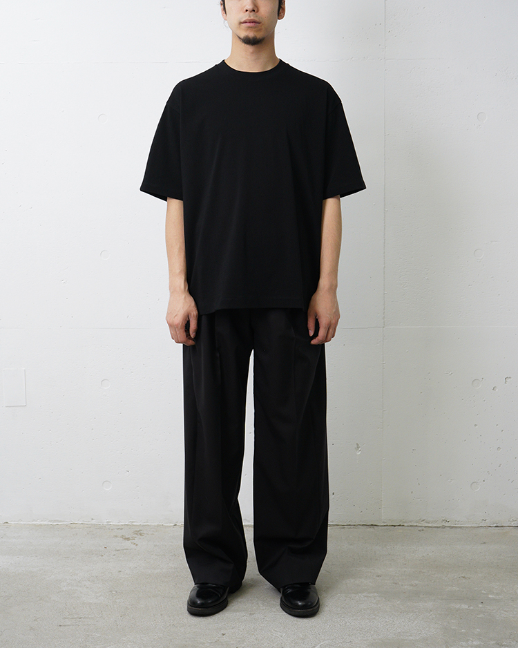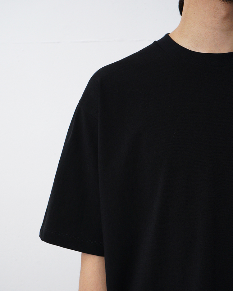 ややオーバーサイズな、ボックスシルエットが特徴のTシャツ。肉厚な素材なので白の透けも気になりません。首元はフライスでしっかり詰まっており、すっきりとした印象です。