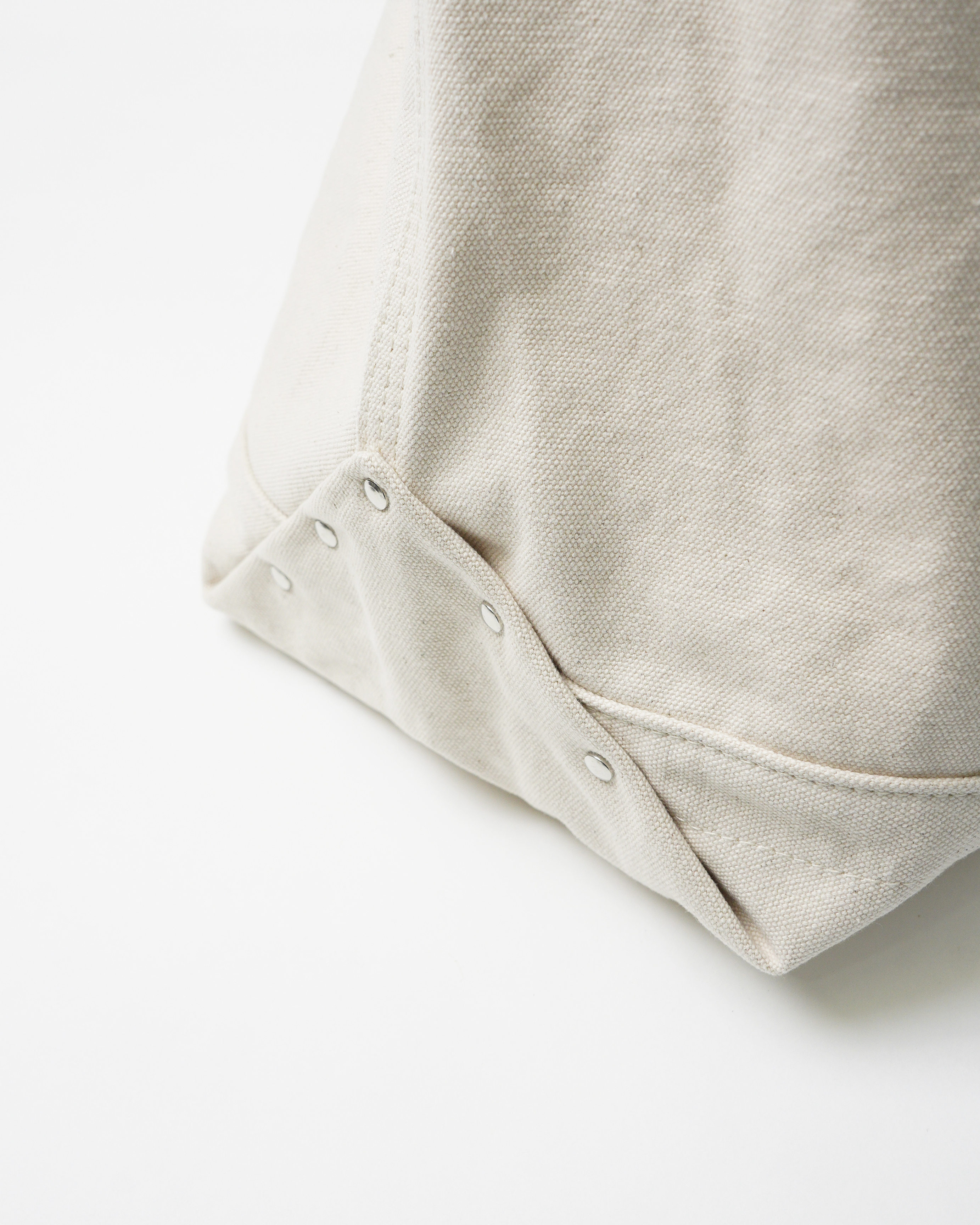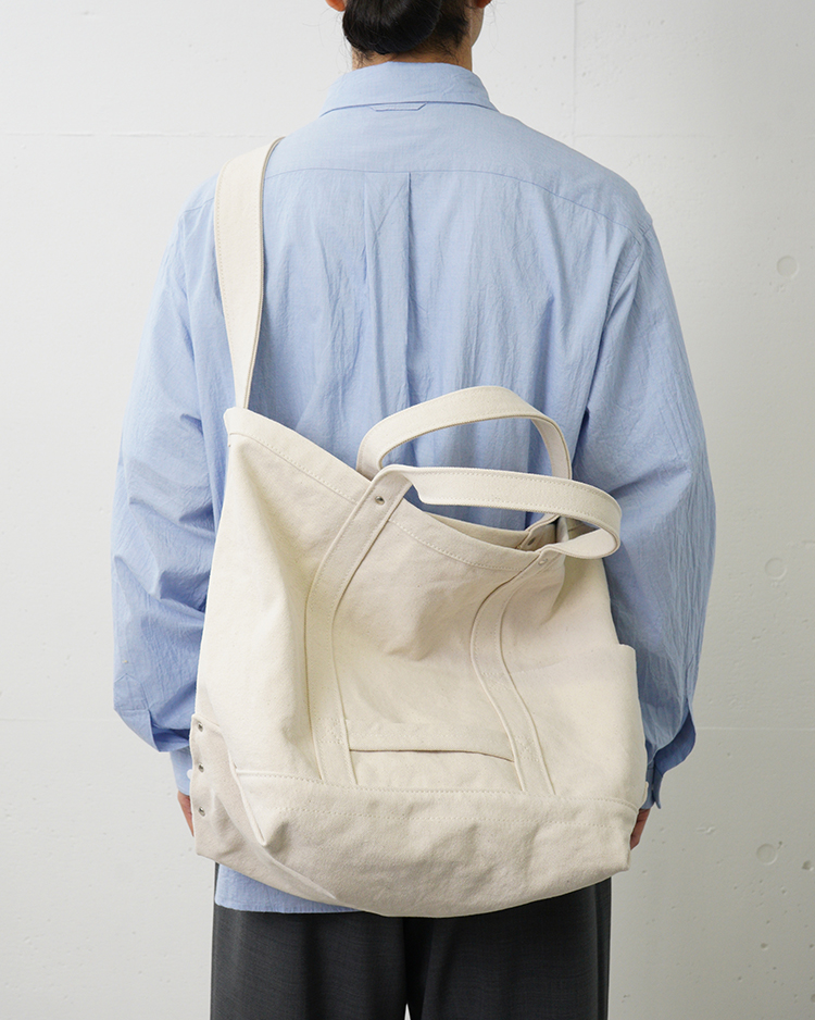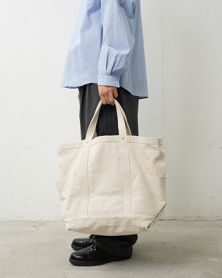 使い込むごとに経年変化を楽しめる厚手のコットンキャンバス素材を使用しています。中底にはナイロン素材の生地を当てることで防水性を持たせ、負荷の強くかかるマチ部分にはリベットで補強がなされています。また内外に三カ所に配置されたポケットには小物やペットボトル等を収納可能です。