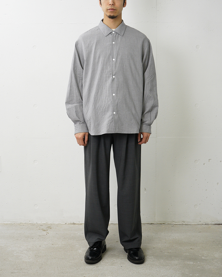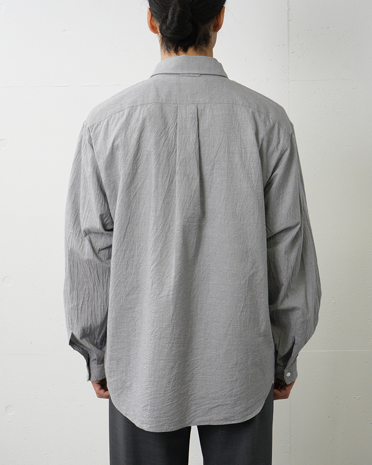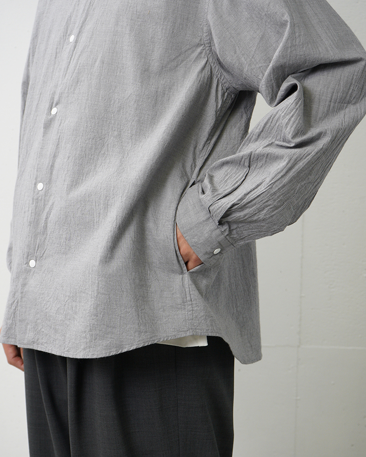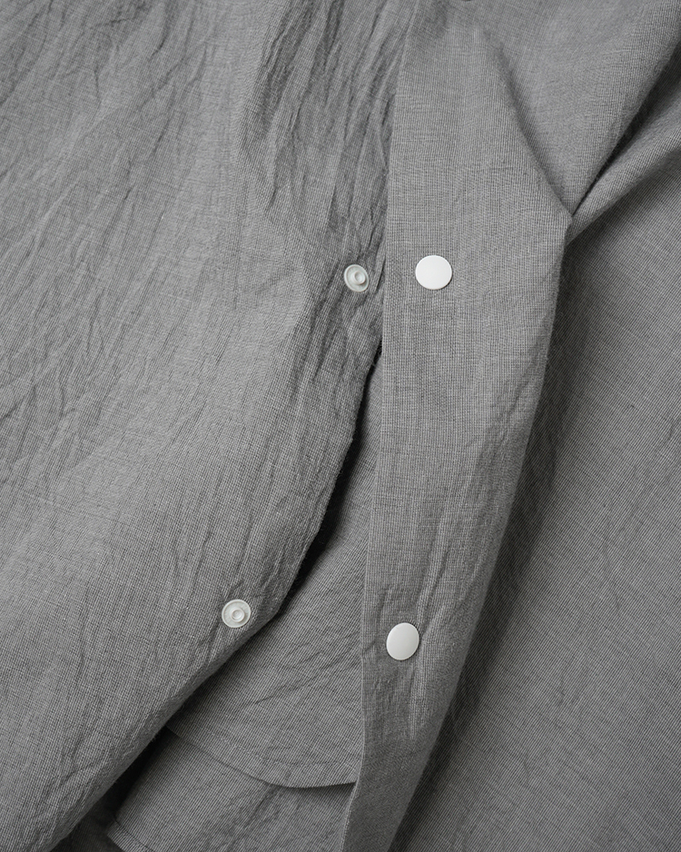ヤエカのシグネイチャー。スラッシュポケットとスナップボタンが特徴のシャツ。 肩から袖にかけて丸みをおびたワイドシルエット。 ふわりと軽くとても柔らかい生地。