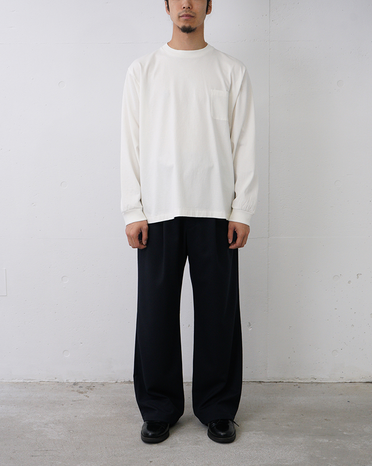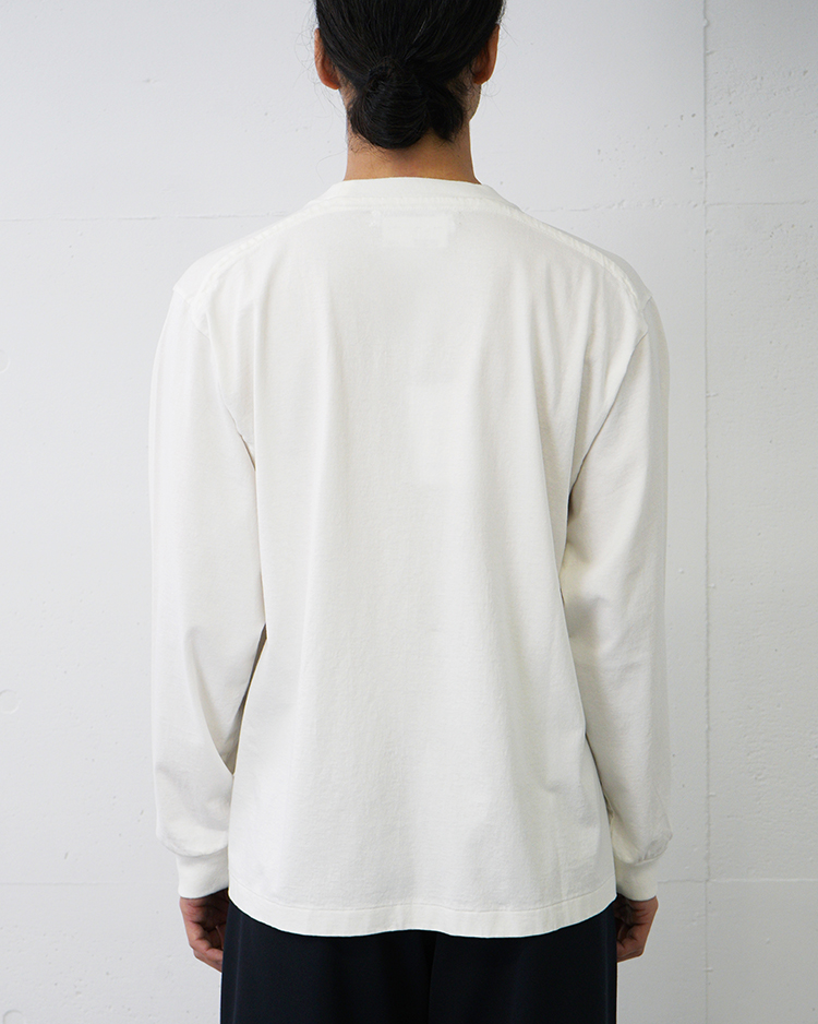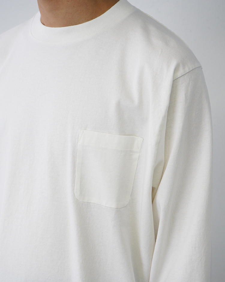 強く撚った綿糸を、密に編み込んで、ドライなタッチのTシャツを作りました。身幅にゆとりを持たせた、リラックスフィットのTシャツです。