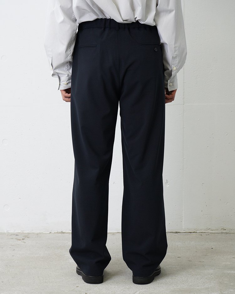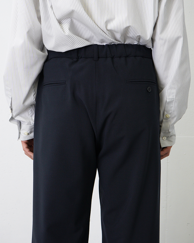 上質な日本製ウールブレンド生地を採用。ウール本来の上品な風合いを保ちながら、優れた伸縮性を備え、適度なハリとシワになりにくい特性が魅力です。さらに、ご家庭で洗濯可能なイージーケア仕様も兼ね備えています。ワイドテーパードシルエットのツータックスラックスで、ウエスト背面をゴム仕様にすることで、上品なルックスと快適さを兼ね備えた一本です。