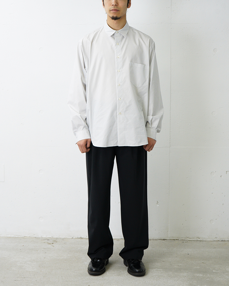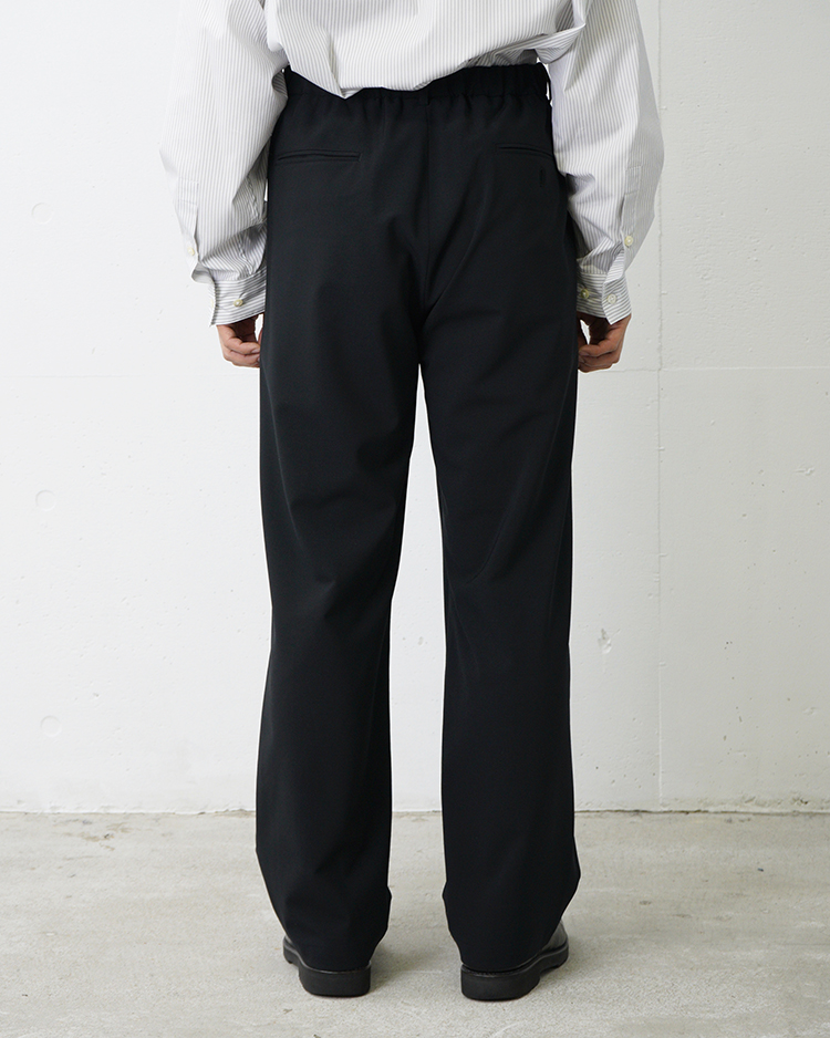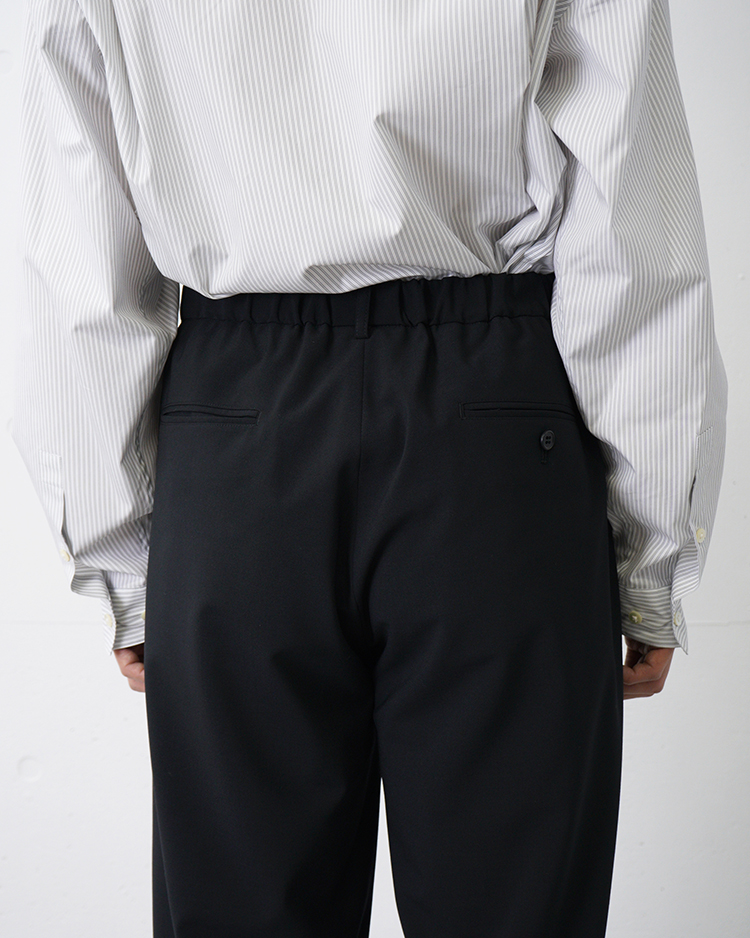 上質な日本製ウールブレンド生地を採用。ウール本来の上品な風合いを保ちながら、優れた伸縮性を備え、適度なハリとシワになりにくい特性が魅力です。さらに、ご家庭で洗濯可能なイージーケア仕様も兼ね備えています。ワイドテーパードシルエットのツータックスラックスで、ウエスト背面をゴム仕様にすることで、上品なルックスと快適さを兼ね備えた一本です。
