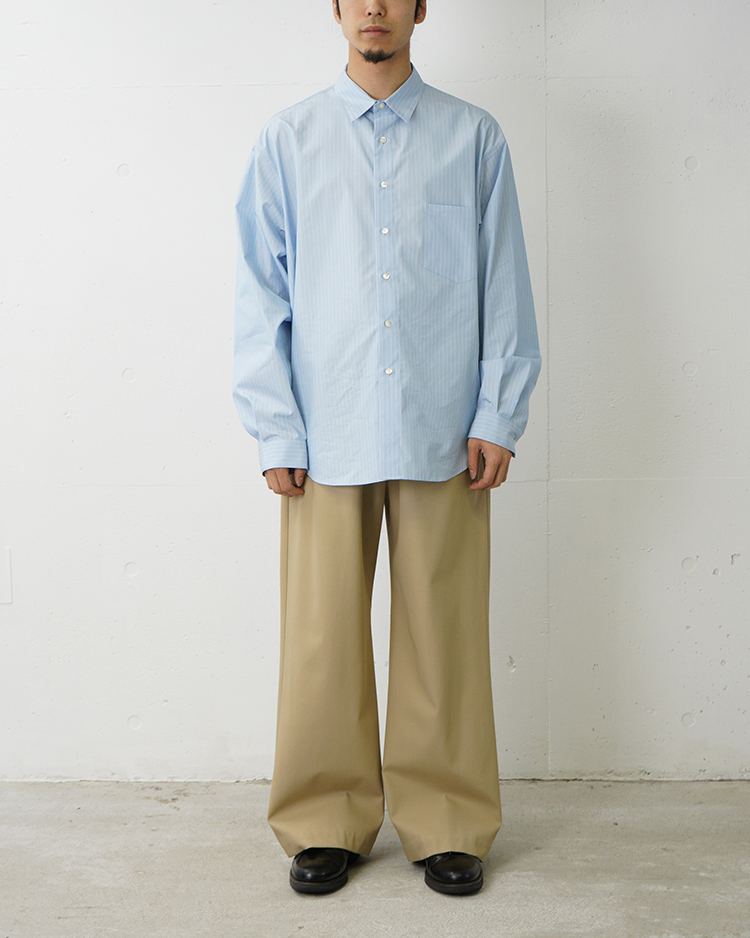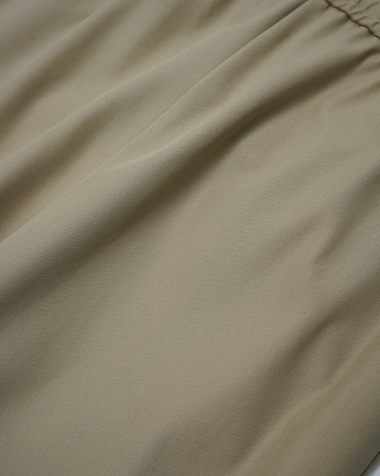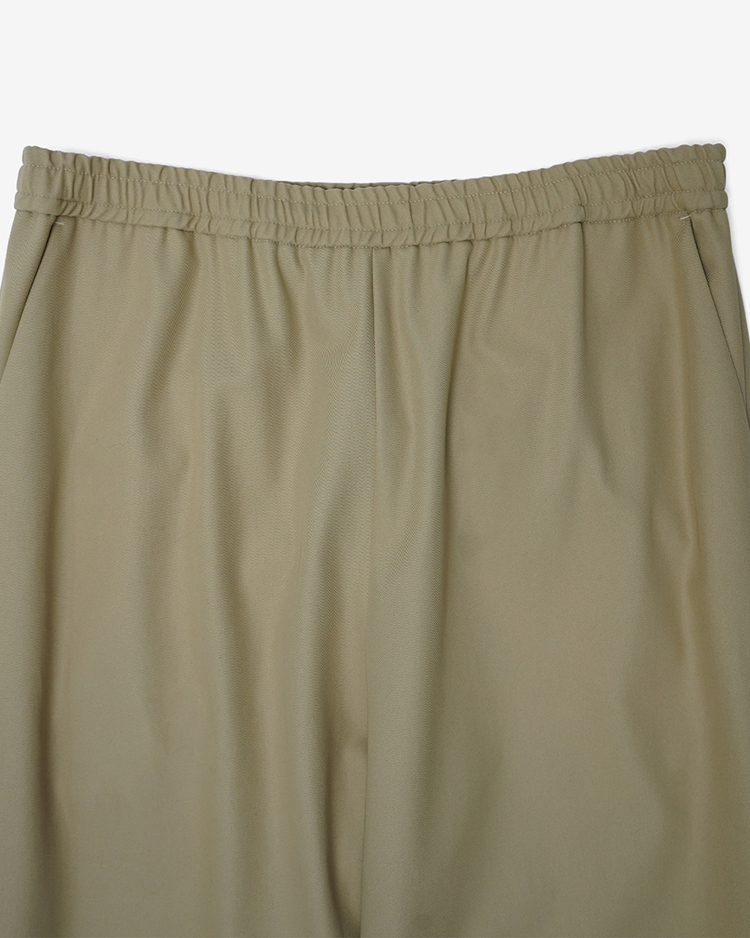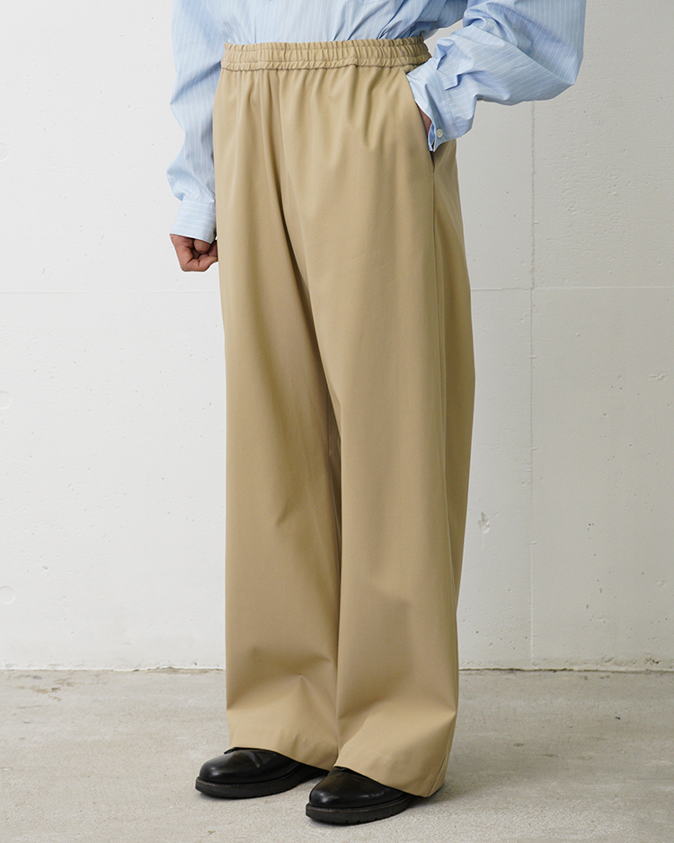 強撚で打ち込みの良いコットンツイルを採用。ドライタッチで美しいハリ感が特徴です。ワイドストレートシルエットのイージーパンツで、ウエストはゴムとドローコード仕様。リラックス感のあるストレスフリーな履き心地に仕上げています。
