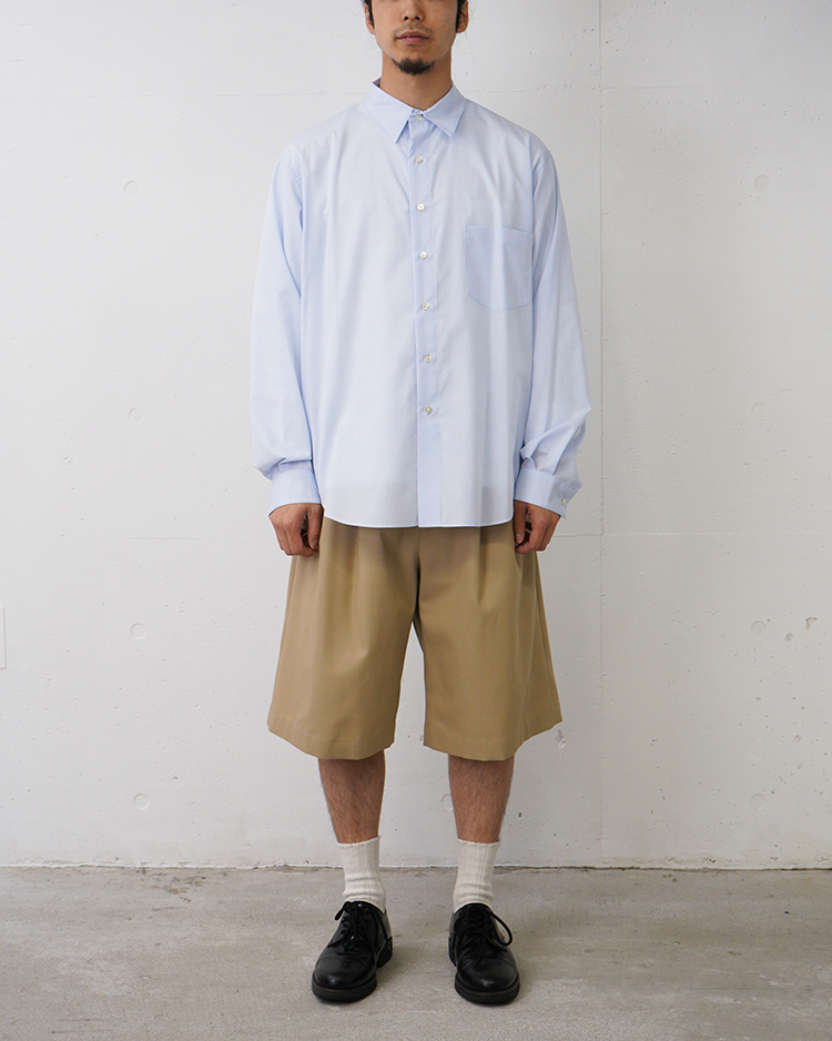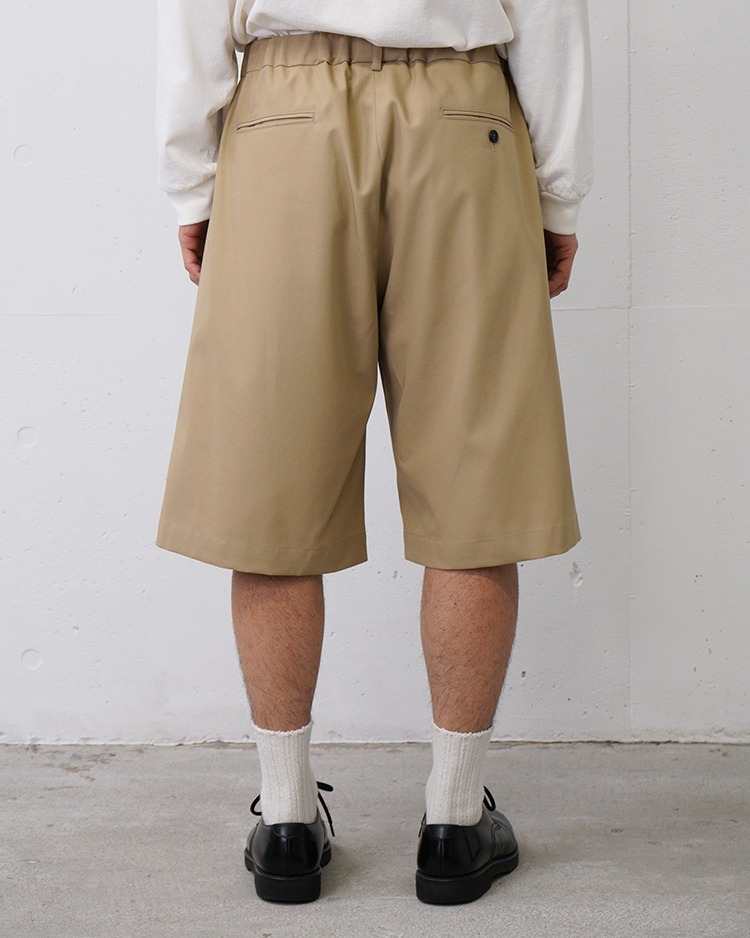 強撚糸を用いた高密度のコットンツイルを採用、ドライなタッチと上品なハリ感が特徴です。ワイドシルエットのツータックショーツで、ワイドシルエットでありながら、洗練された印象に仕上げました。さらに、ウエスト背面にゴム仕様を取り入れることで、見た目の美しさと快適な履き心地を両立しています。