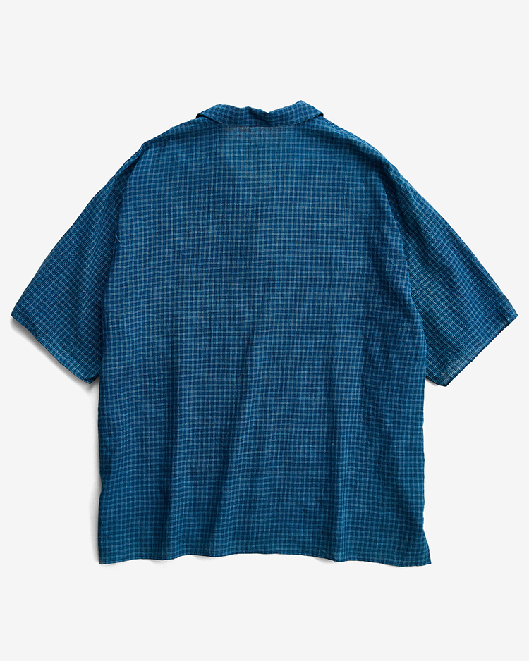 インドで手紡ぎ・手織りされ本藍による草木染めの先染めチェック柄を施したカディコットン生地で製作したオープンカラーシャツ。極細糸で構成された精緻なチェックを手織り機で生産するためには非常に高い集中力と技術を要し、まさにクラフトマンシップの結晶とも言える素材。型は1950年代のUSヴィンテージシャツをリファレンスとしたボックスシルエット。ラウンドカラーの柔和さとゆとりある身頃によって風を孕むような軽やかさを演出。