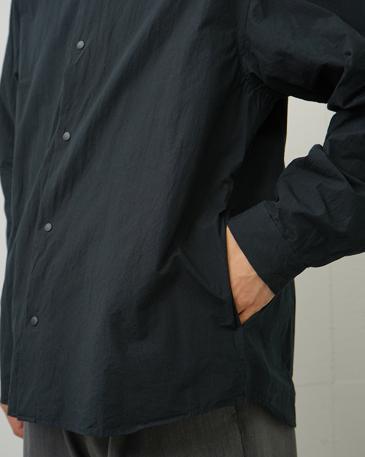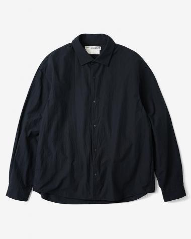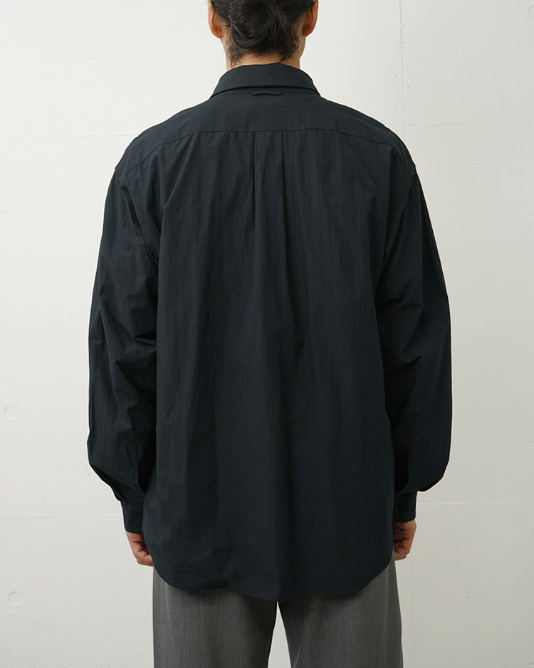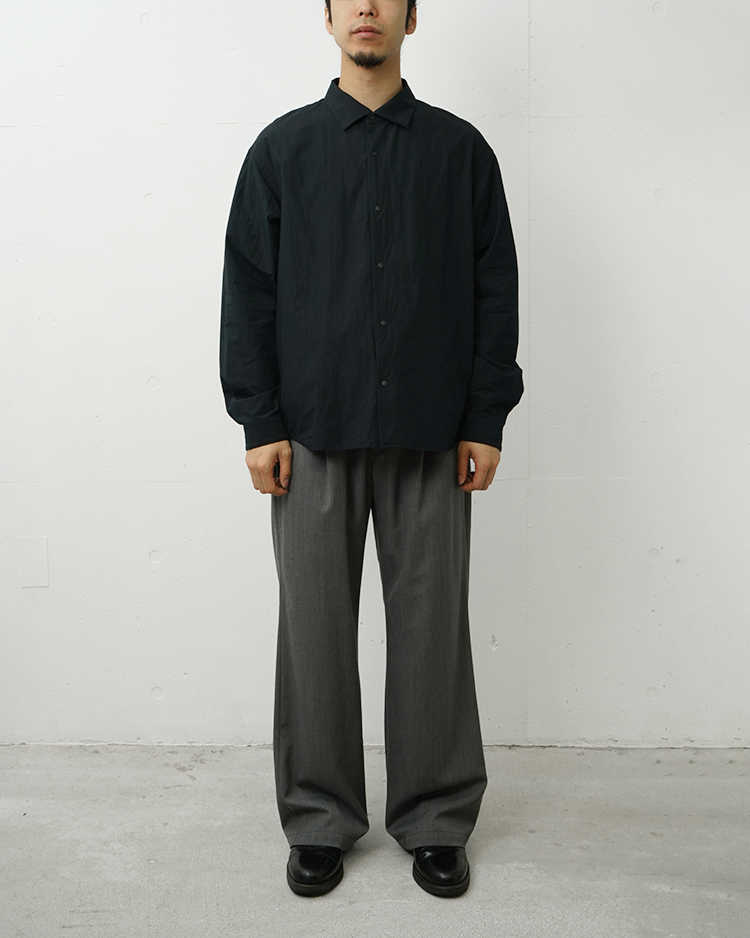 YAECAの定番「エクストラワイドコンフォートシャツ」をベースに、Dice&Diceの別注仕様として製作された特別なモデルです。肩幅と身幅にたっぷりとゆとりを持たせた、リラックス感のあるシルエットが特徴。一番のポイントである前立てのスナップボタンは、片手でスムーズに開閉できるユニバーサルデザインを採用しています。生地には、YAECAが長年作り続けている定番のシャツ地を使用。細番手の糸を限界まで高密度に織り上げることで、ペーパーライクなパリッとした質感と、肌離れの良いさらりとした着心地を実現しています。