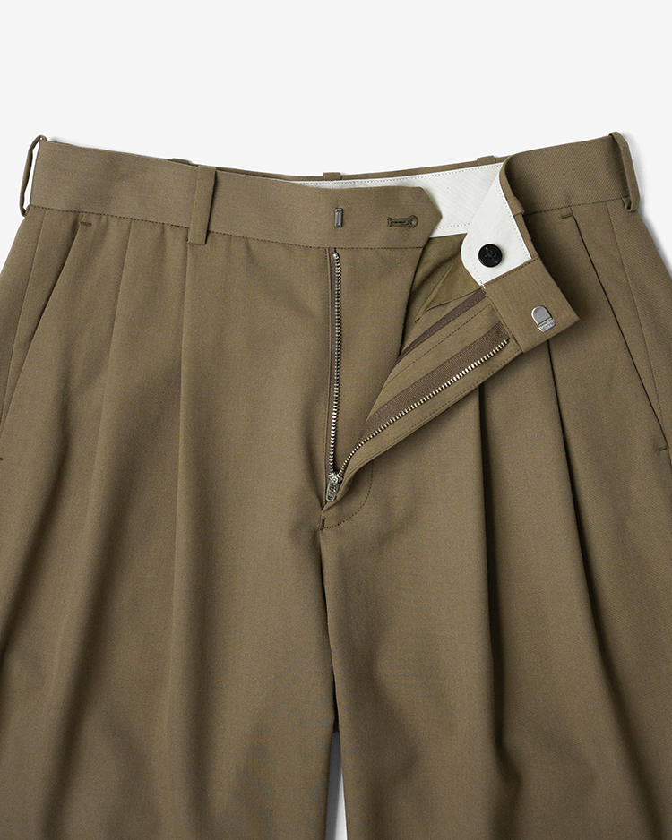 毛織物の名産地・尾州で織り上げた、72番双糸のギャバジン素材を使用。高密度に織り上げることで、ハリとコシを持たせつつ、しなやかで上品な風合いに仕上げました。シワになりにくく、美しい立体感のあるシルエットを長くキープできるのも魅力です。ツータック仕様の程よくゆとりを持たせたシルエット、自然なボリューム感とやや長めの丈感で、落ち着きのある印象に仕上げています。
