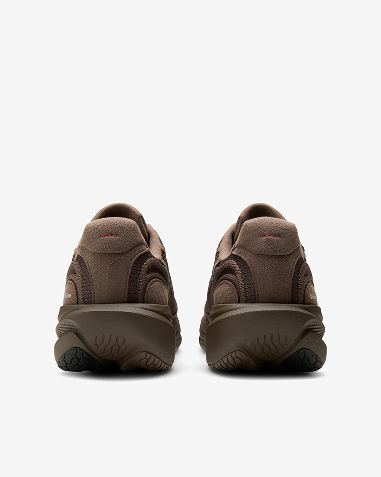 日常のランニングに求められるあらゆる要素を凝縮した「1080v15」は、驚異的な耐久性とエネルギーリターンを誇る最新のInfinionフォームを搭載し、最も快適なランニングシューズのあり方を新たな視点から捉え直した一足です。今回のDistrict Visionとのコラボレーションでは、その高い機能性に、モノトーンのアースカラーを基調としたミニマリズム溢れるデザインを融合させました。1990年代のシューズから着想を得たアッパーは、全体にメッシュベールを重ねた奥行きのあるレイヤード構造で表現されており、トゥボックスやオーバーレイに配したClarino™スエードが上質な触感を演出します。サイドに施された織り込みの「N」ロゴなど、過剰な装飾を削ぎ落としながらも細かなテクスチャーにこだわることで、機能美と洗練されたスタイルが共存する特別な一足に仕上がっています。