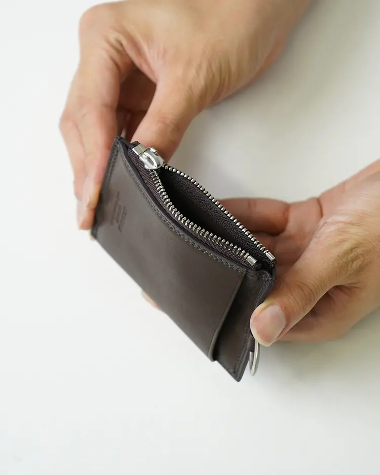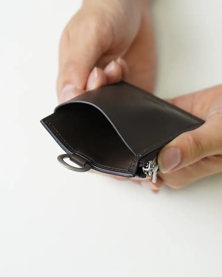 HAAS社のアルザスレザーを使用したジップカードケース。ブラウン色には仔牛皮革 のハイブリッド鞣しを使用し、ブラックには「ブラックダイヤ」と呼ばれるキャビア に似た質感のレザーを使用しています。両面にカードが収納でき決済時にも干渉しな い設計です。サイドのファスナーポケットにはコインなども収納可能。別売りのスト ラップと組み合わせることで、首掛けや肩掛け、ポケット内収納など、目的や装いに 応じて様々な使用方法ができるアイテムです。今シーズンはBROWNカラーを新しく つくりました 。