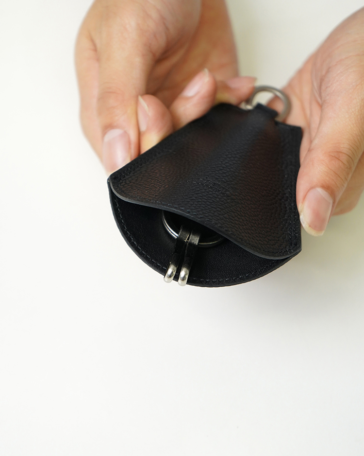HAAS社のアルザスレザーを使用したベル型キーホルダー。ブラウン色には仔牛皮革 のハイブリッド鞣しを使用し、ブラックには「ブラックダイヤ」と呼ばれるキャビア に似た質感のレザーを使用しています。別売りのストラップと組み合わせることで、 首掛けや肩掛け、ポケット内収納など、目的や装いに応じて様々な使用方法ができる アイテムです。今シーズンはBROWNカラーを新しくつくりました。
