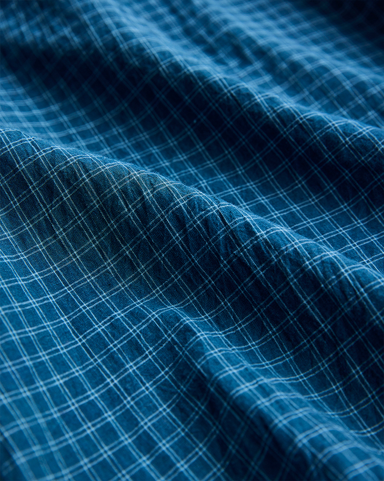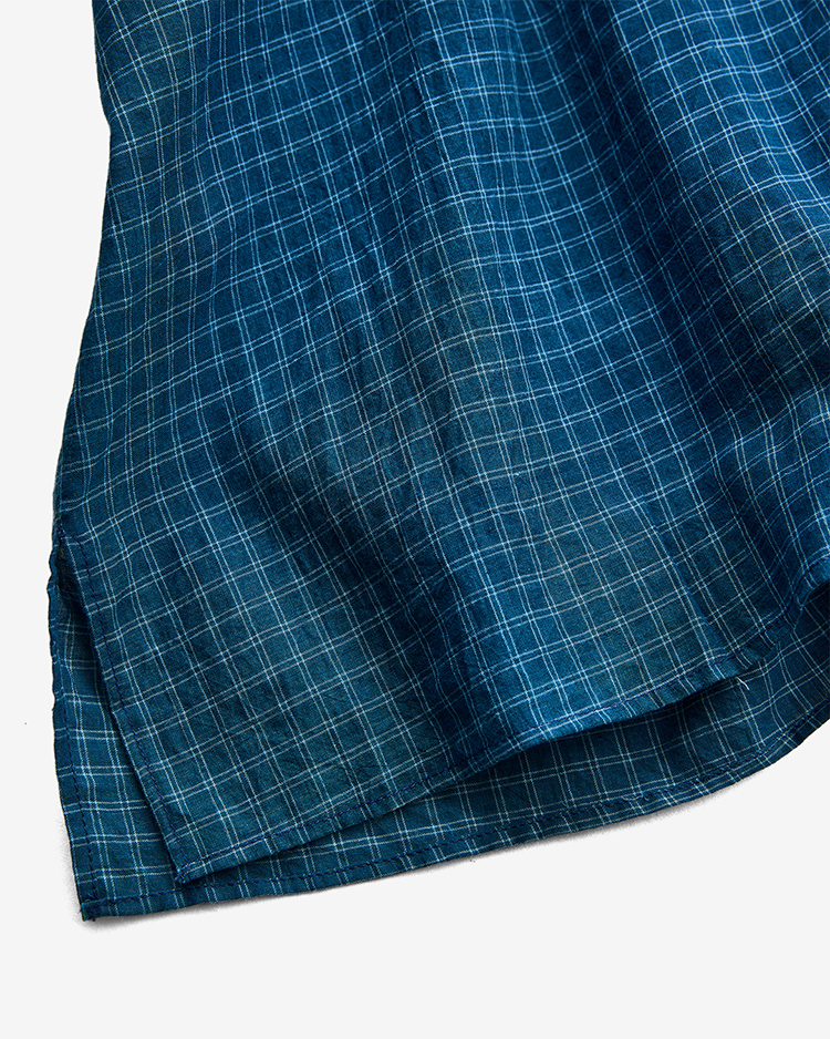 インドで手紡ぎ・手織りされ本藍による草木染めの先染めチェック柄を施したカディコットン生地で製作したオープンカラーシャツ。極細糸で構成された精緻なチェックを手織り機で生産するためには非常に高い集中力と技術を要し、まさにクラフトマンシップの結晶とも言える素材。型は1950年代のUSヴィンテージシャツをリファレンスとしたボックスシルエット。ラウンドカラーの柔和さとゆとりある身頃によって風を孕むような軽やかさを演出。