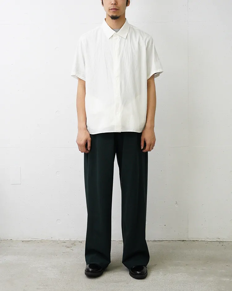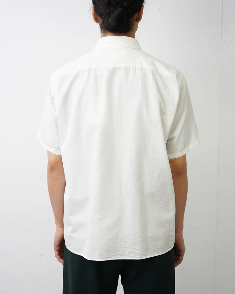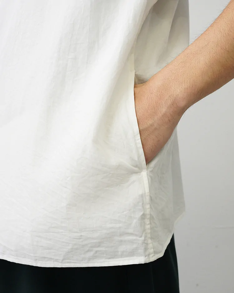 ヤエカのシグネイチャー。スラッシュポケットとスナップボタンが特徴のシャツ。 程よいリラックスボックスシルエット。 生地はコットンシルクの薄く滑らかなツイル