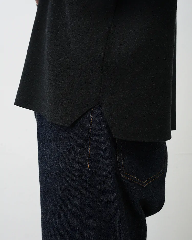 職人の手作業によるリンキング縫製を使い、ニットならではの伸縮性、減らし目の技術を使ったスリットなど、随所にこだわった作りながら、肌離れよくリラックスした着心地を目指した一着。