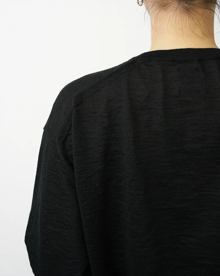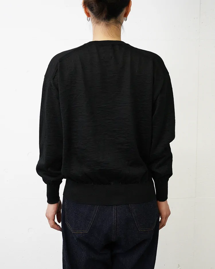 光沢感と清涼感が特徴のロイヤルラミーを極細番手に紡績した繊細な糸を使用。ハイゲージの編機でゆっくりと編み立てており、ラミー特有のハリコシと透け感、凹凸やシボ感が感じられる表情豊かで肌離れの良い商品となっています。