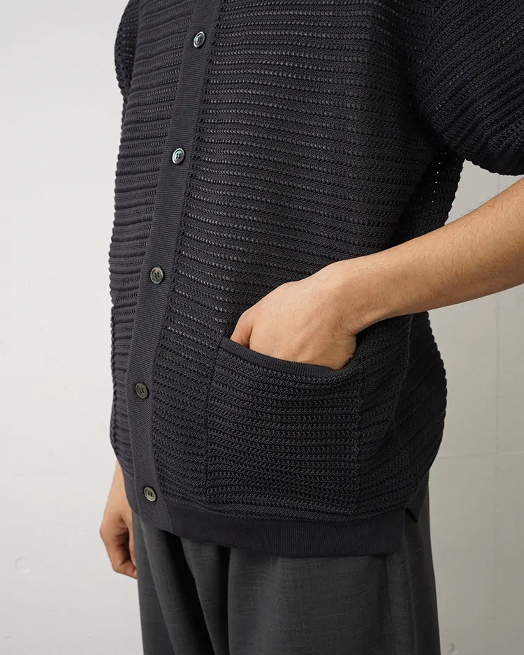 細番手のコットン糸に、特殊な天然由来樹脂をコーティングした糸を多本取りで透かし編みで編み立てたサマーニットシリーズ。肌が透けにくい編柄で編み立てながらも、非常に風通しの良い編地が特徴となっています。