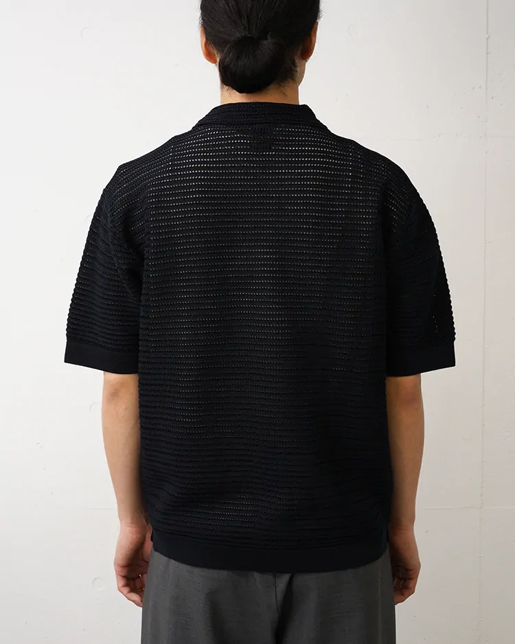 細番手のコットン糸に、特殊な天然由来樹脂をコーティングした糸を多本取りで透かし編みで編み立てたサマーニットシリーズ。肌が透けにくい編柄で編み立てながらも、非常に風通しの良い編地が特徴となっています。
