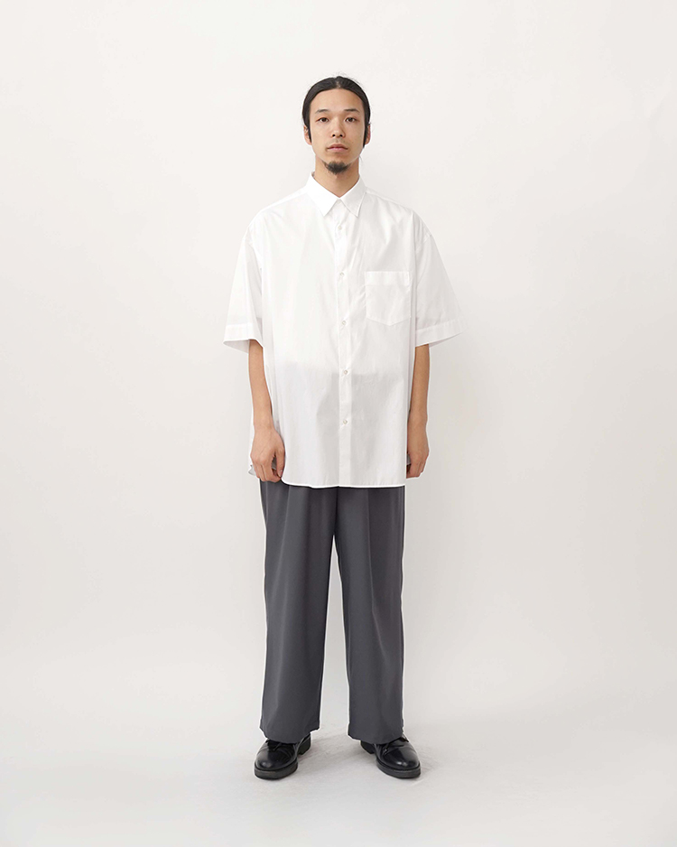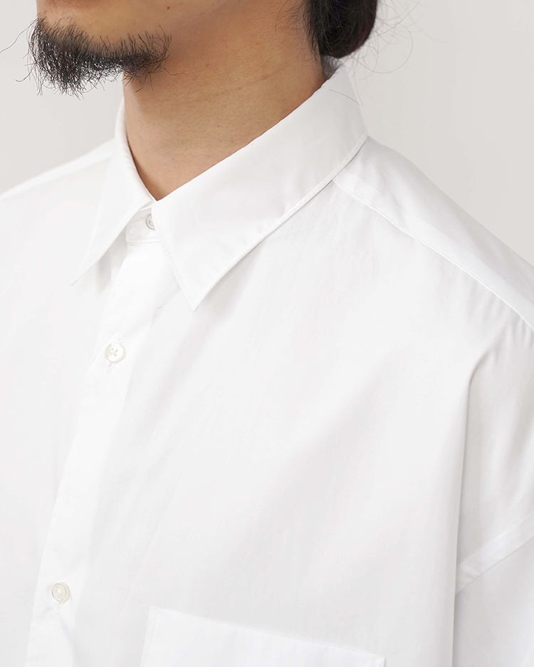 なめらかに整った繊維そのものの光沢感と、均一な撚りにより毛羽立ちにくい超長綿であるスーピマコットン。非常に繊細な糸番手で製織したブロード生地を使用。高級シーツにも使用されている生地で適度なハリと柔らかさがあり着心地が非常に良い。ドロップショルダーでボリュームのあるボックスシルエット。オーセンティックなレギュラーカラーのショートスリーブ。肩の傾斜や低く下げられたヨークの位置、アームホールの広さなど、細かなディテールを特異なバランスで仕上げたビッグシルエットが特徴のオックスフォードシャツのサイズをベースにすることで、今まで以上に余白を楽しめる独自のバランスに仕上がっている。