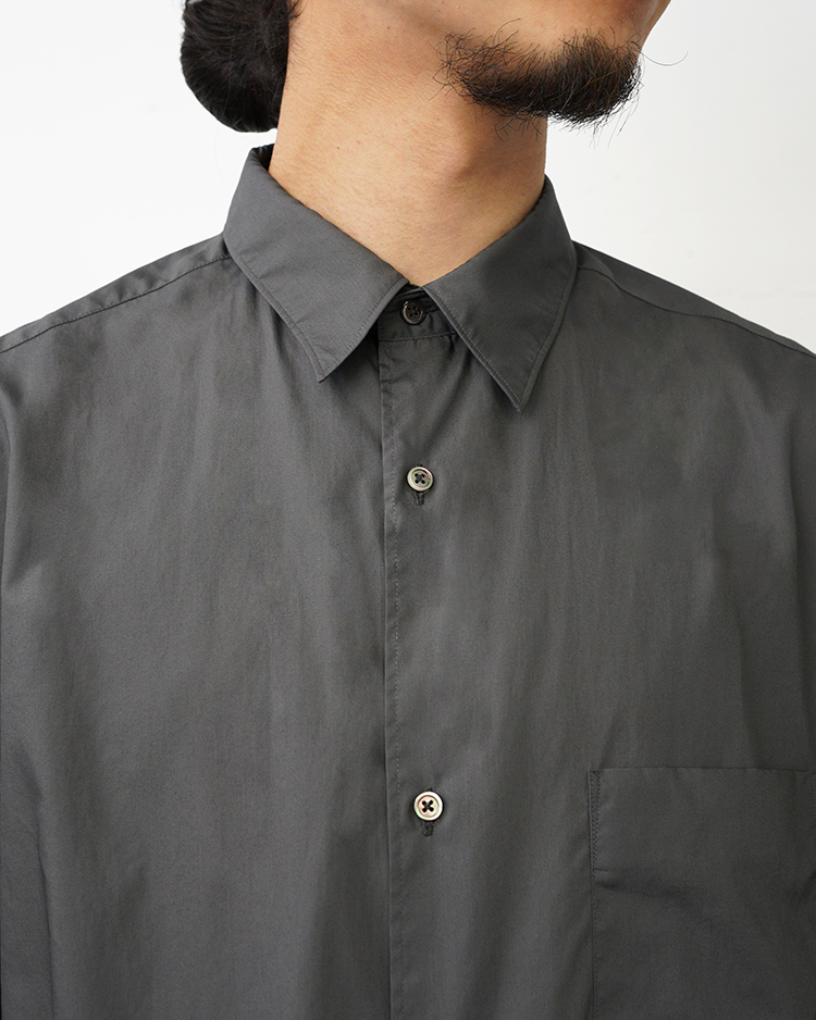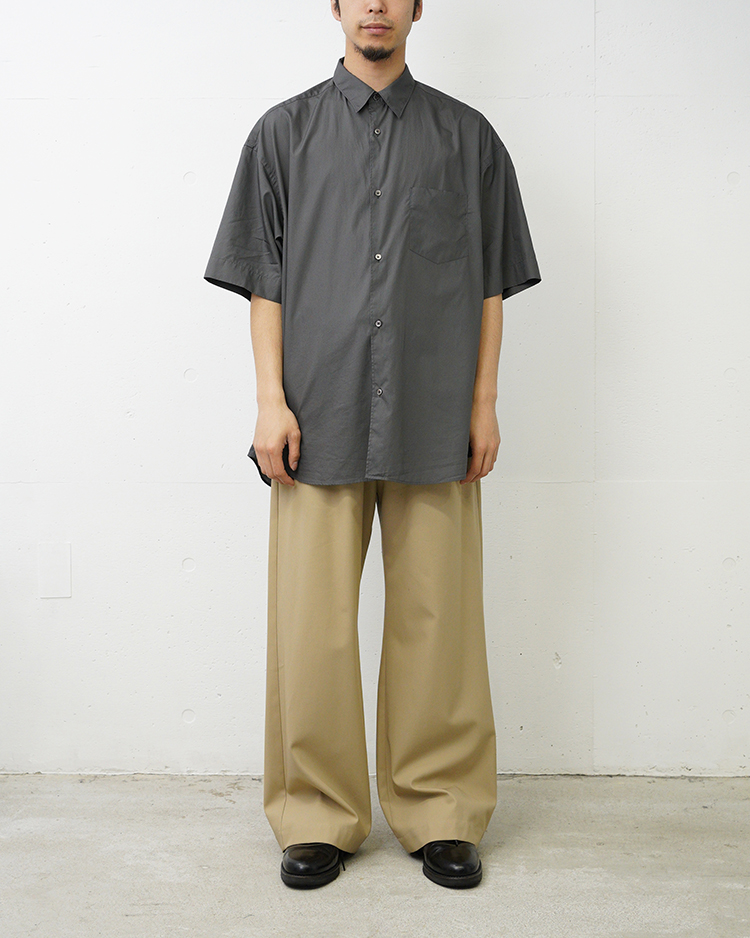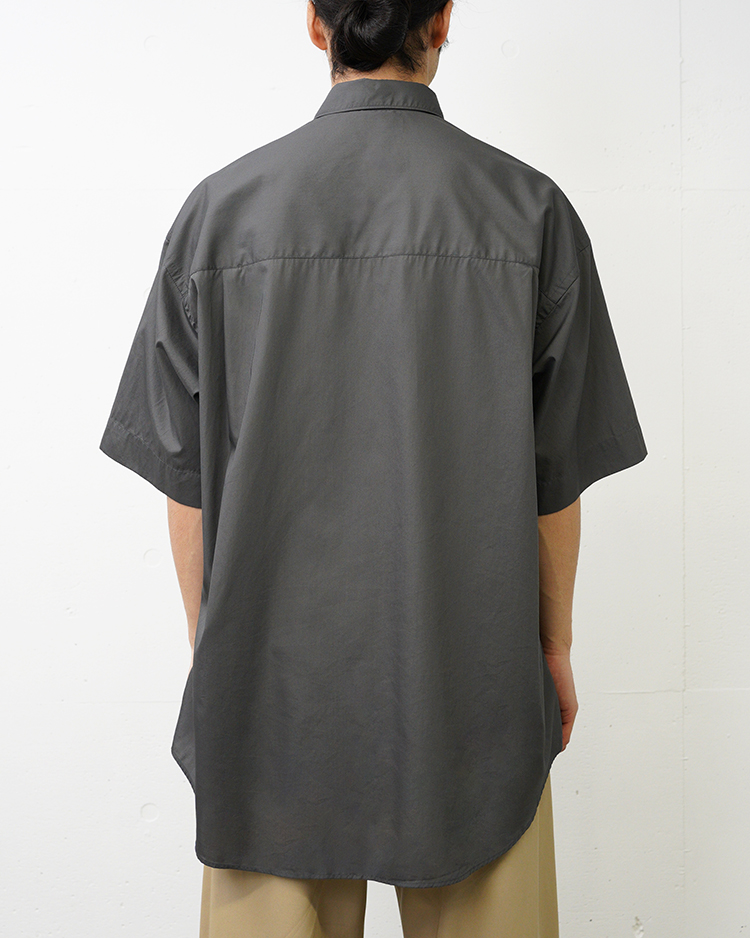 なめらかに整った繊維そのものの光沢感と、均一な撚りにより毛羽立ちにくい超長綿であるスーピマコットン。非常に繊細な糸番手で製織したブロード生地を使用。高級シーツにも使用されている生地で適度なハリと柔らかさがあり着心地が非常に良い。ドロップショルダーでボリュームのあるボックスシルエット。オーセンティックなレギュラーカラーのショートスリーブ。肩の傾斜や低く下げられたヨークの位置、アームホールの広さなど、細かなディテールを特異なバランスで仕上げたビッグシルエットが特徴のオックスフォードシャツのサイズをベースにすることで、今まで以上に余白を楽しめる独自のバランスに仕上がっている。