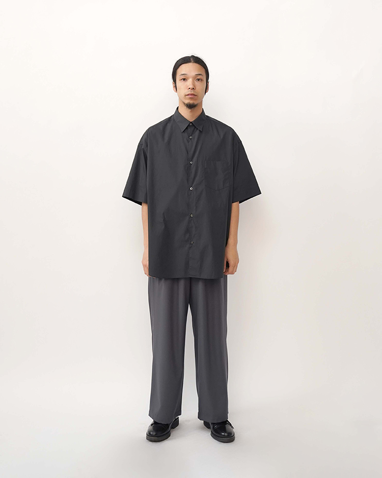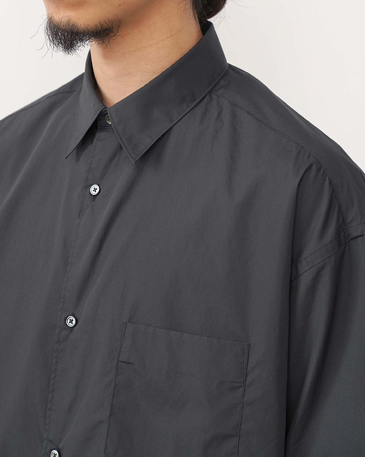 なめらかに整った繊維そのものの光沢感と、均一な撚りにより毛羽立ちにくい超長綿であるスーピマコットン。非常に繊細な糸番手で製織したブロード生地を使用。高級シーツにも使用されている生地で適度なハリと柔らかさがあり着心地が非常に良い。ドロップショルダーでボリュームのあるボックスシルエット。オーセンティックなレギュラーカラーのショートスリーブ。肩の傾斜や低く下げられたヨークの位置、アームホールの広さなど、細かなディテールを特異なバランスで仕上げたビッグシルエットが特徴のオックスフォードシャツのサイズをベースにすることで、今まで以上に余白を楽しめる独自のバランスに仕上がっている。