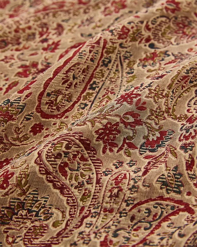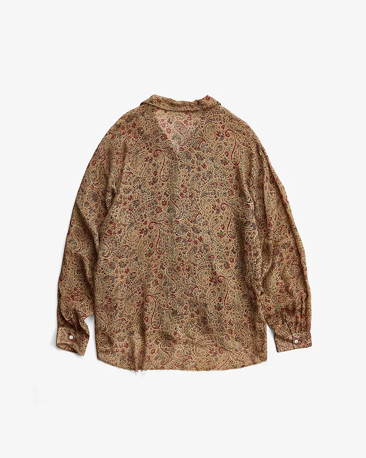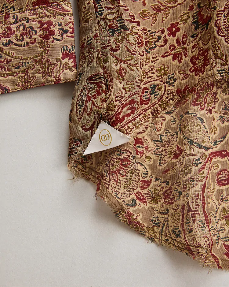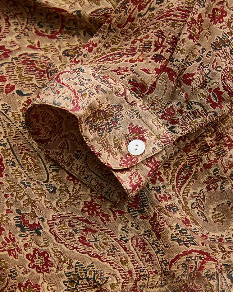 南インドのプリント工場に眠っていたデッドストックのインド産シルクシフォン生地を使用したロースロープシャツ。型はイタリアンシャツの美しい佇まいをベースにしながら、パーカーのように気軽に羽織れるシルエットへ再構築。肌に触れた瞬間に感じる極上の柔らかさと、リラックス感を併せ持つ軽やかな着心地が特徴です。極薄ながらもシルクが持つ体温調整機能によって、通気性と保温性の両方を備えています。