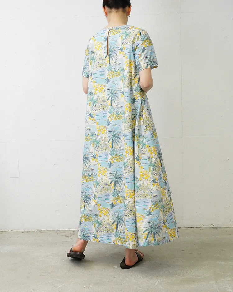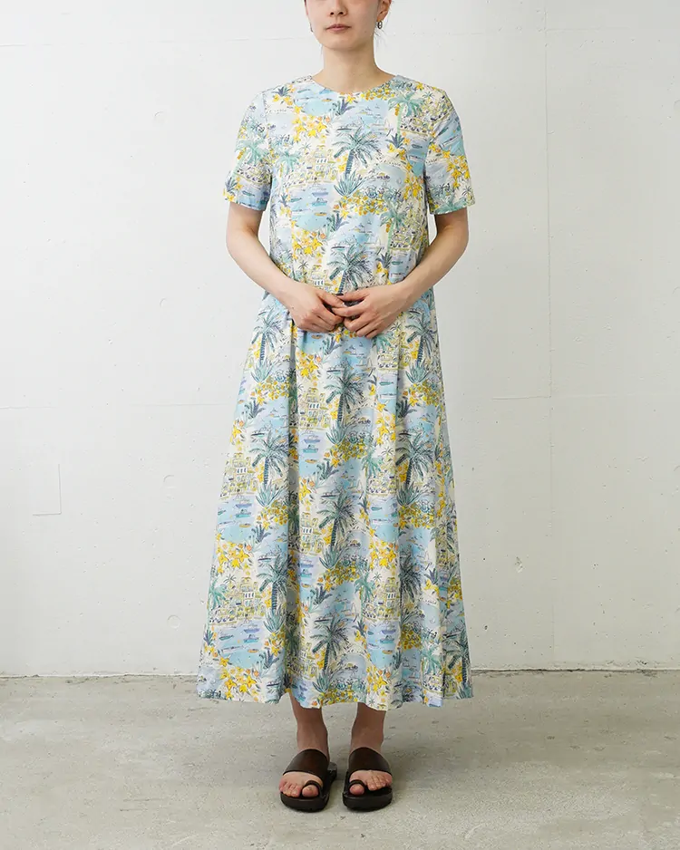 クラシックなシルエットで、丈はくるぶし上あたり。生地はリバティの「CAPE VISTA」を別注しています。