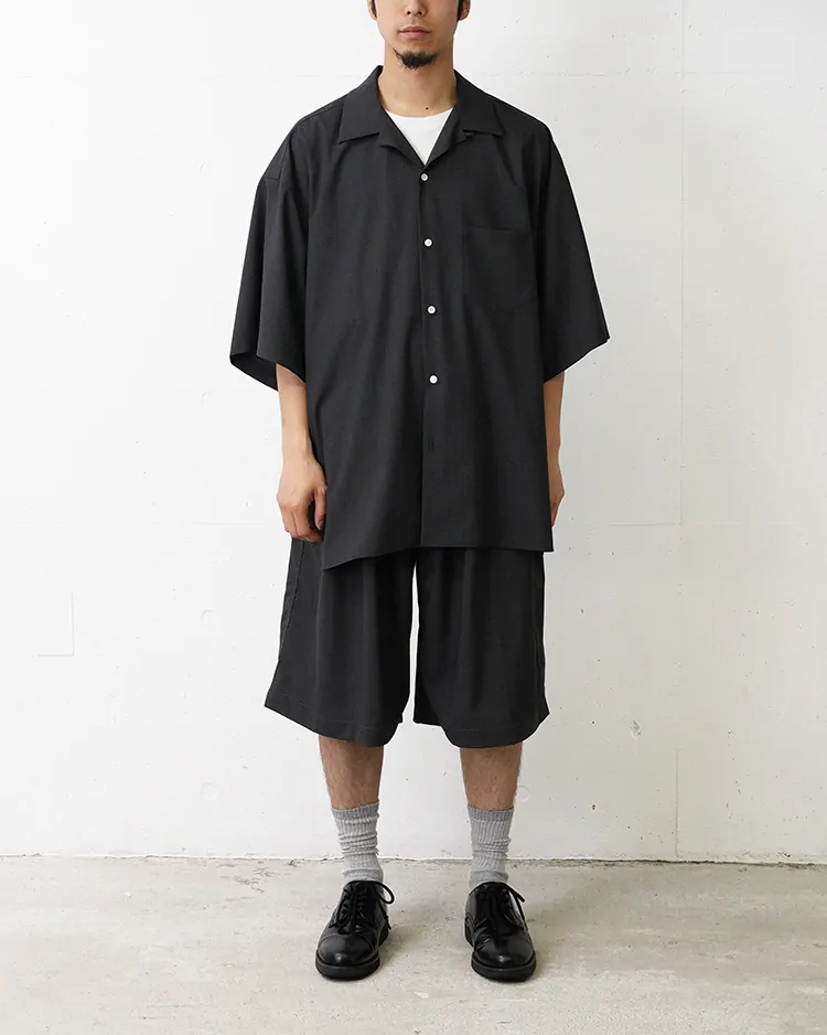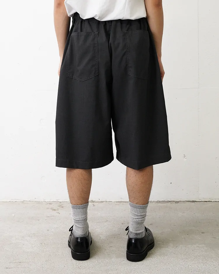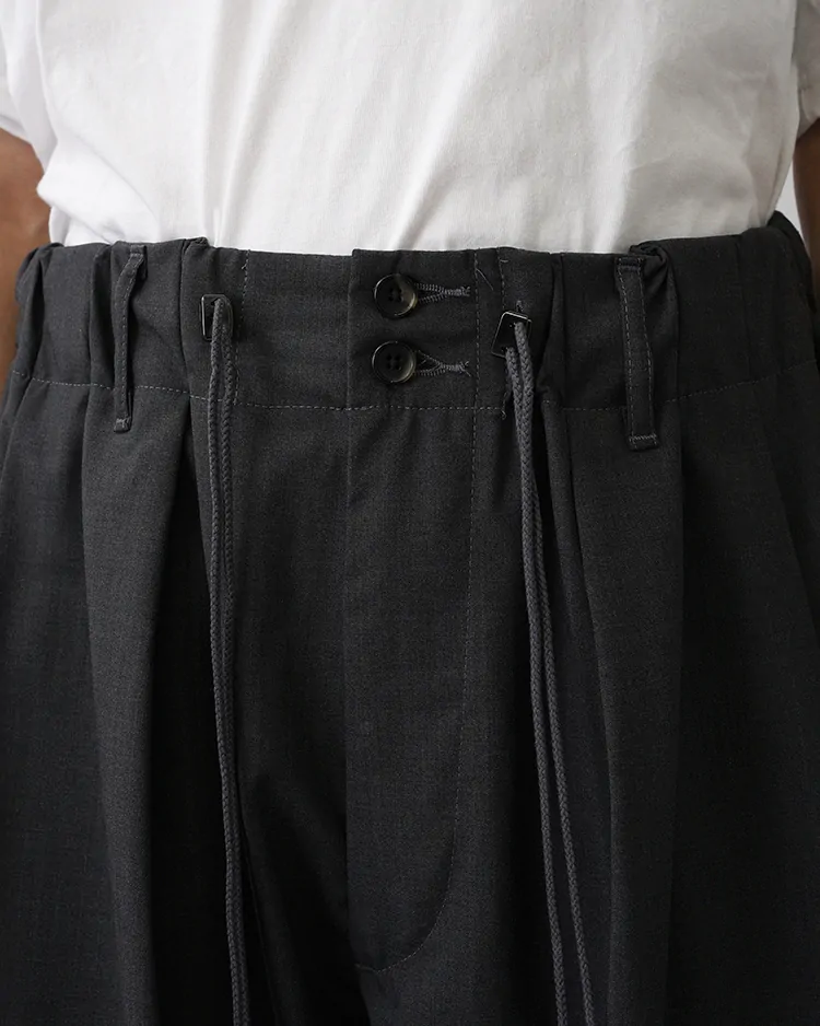 ”CIRCULAR” サーキュラーパンツ 非常にワイドで円を描くようなシルエットが特徴のSillageを代表するパンツ。ワイドでゆったりとしたシルエットながら急激なテーパードから生まれるドレープがこのパンツの唯一無二の美しさです。アイコニックな2本のドローコードにストッパーをつけ、履きやすさを提案。こちらはショーツタイプです。生地は梳毛の超ハイゲージウールを使用したトロピカルウールです。オールシーズン着用可能です。