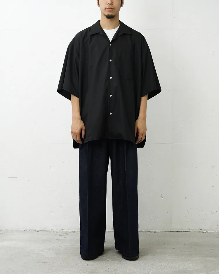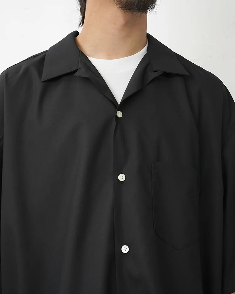 ESSENTIAL コレクションとしてオープンカラーのオーバーシャツ仕様。羽織りとして使っていただくこともインナーとしてジャケットと合わせていただくことも可能。パンツのチョイスでセットアップの全体のシルエットをお好みに変化させられます。素材は定番のウールトロピカル。着丈を新しくしたニューバージョンです