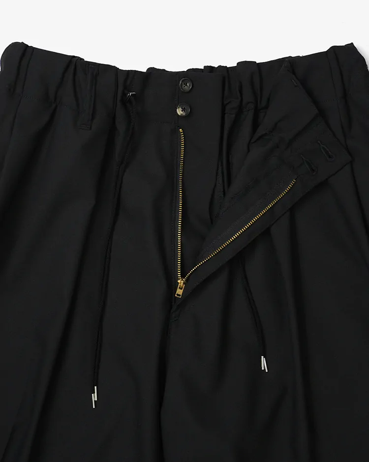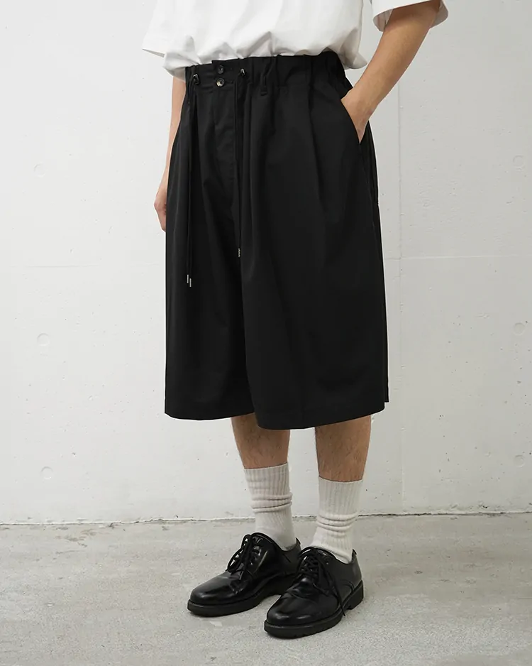 ”CIRCULAR” サーキュラーパンツ 非常にワイドで円を描くようなシルエットが特徴のSillageを代表するパンツ。ワイドでゆったりとしたシルエットながら急激なテーパードから生まれるドレープがこのパンツの唯一無二の美しさです。アイコニックな2本のドローコードにストッパーをつけ、履きやすさを提案。こちらはショーツタイプです。生地は梳毛の超ハイゲージウールを使用したトロピカルウールです。オールシーズン着用可能です。