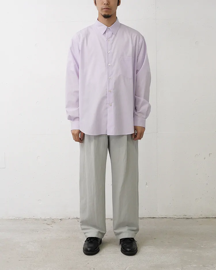タテにコットンの強燃糸、ヨコに細番手のリネン糸を使い、静岡県浜松市でやや甘めに織り上げたビエラ素材です。コットンの強燃糸のサラッとしたタッチと、リネンのゴワっとしたハリ感が特徴です。製品で染める事で、縮みも起きず、速乾性も兼ね備えた素材です。